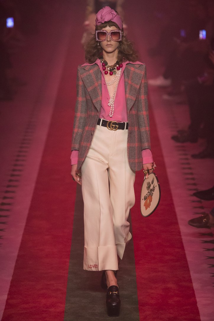 По уже сложившейся традиции, Алессандро Микеле удивлял гостей показа собственной трактовкой концепции дома моды Gucci. На этот раз дизайнер, словно змей-искуситель, красовавшийся на приглашениях, соблазнял гостей роскошными фатиновыми платьями, мерцанием тканей и пайеток, принтами и аппликациями с изображением королевских гербов, львов, драконов и зебр, «пижамными» костюмами, атласными кюлотами, принтованными шубами, вышитыми цветами, множеством оборок и рюшей и, конечно же, любимыми дизайнером огромными цветными очками.