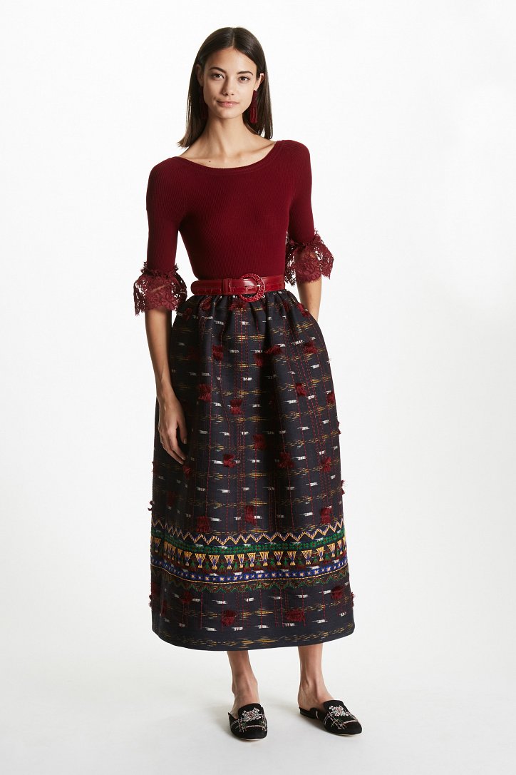 Крестьянские блузы, воланы на рукавах, ажурный трикотаж, вязаные элементы, богатые коричневые тона и вышивка – в новой коллекции Oscar de la Renta pre-fall 2017 громче всего слышны этнические мотивы.