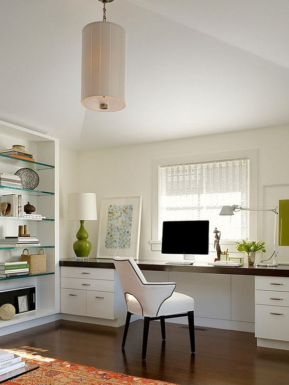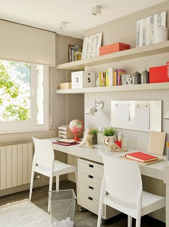 Если одного рабочего места недостаточно, его легко можно превратить в два. Стол с перегородкой или удлиненная столешница – для тех, кто не может обустроить два отдельных домашних офиса.