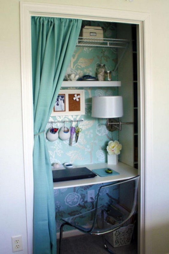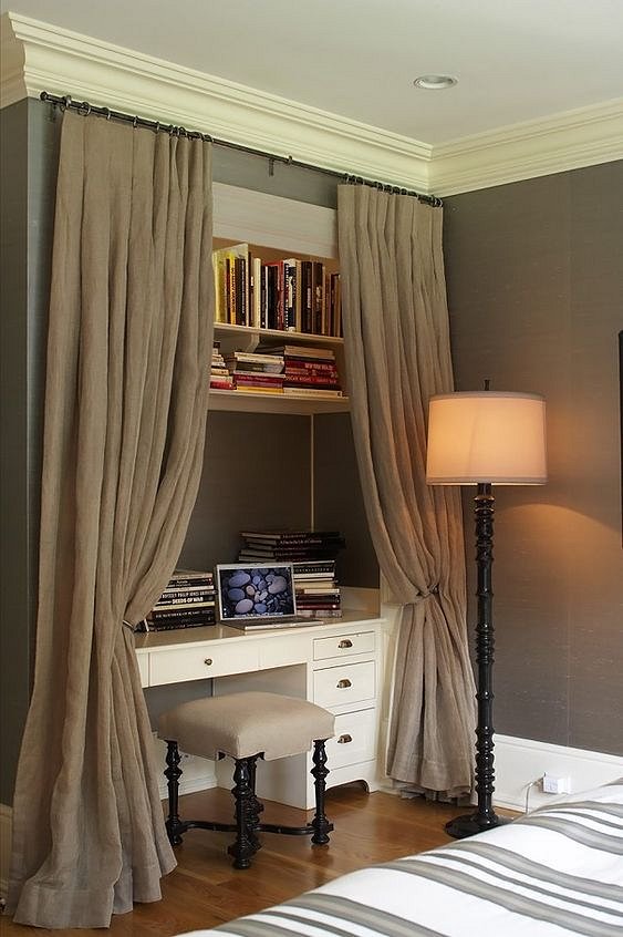 Если хотите спрятать рабочее место от посторонних глаз, можно использовать ширму или шторку. И удобно, и уютно. Еще один способ – убрать в шкаф. Вариантов несколько. Первый – интегрировать стол в обычный шкаф, второй – приобрести специальный шкаф-трансформер.