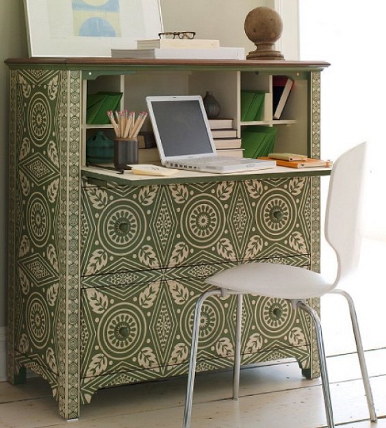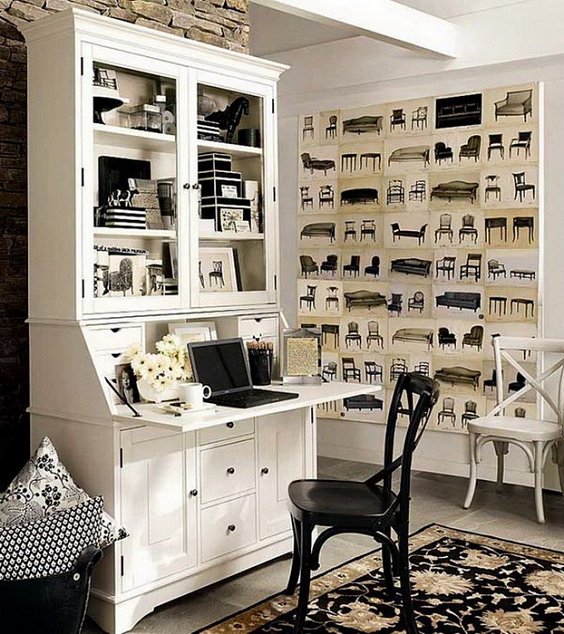 Если много места для работы вам не нужно – обустроить компактное рабочее место можно в секретере. Преимуществ сразу несколько: экономия места, мебель лишнюю покупать не нужно, да и спрятать такой кабинет можно за пару секунд