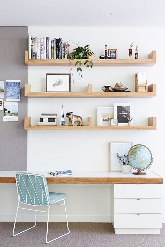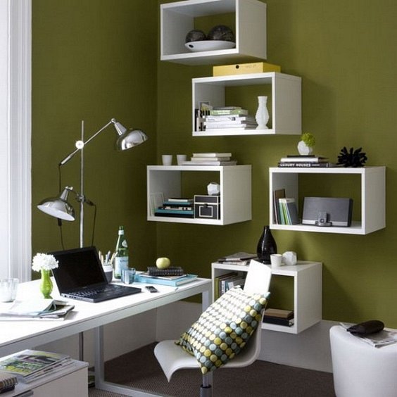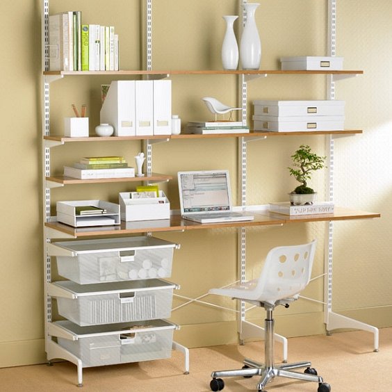 Дизайн рабочего места в квартире необходимо продумать так, чтобы все было под рукой. А значит, без полочек и стеллажей не обойтись. Выбор ограничен только вашей фантазией и бюджетом: открытые полки и навесные модули, легкие стеллажи и комоды, цельная конструкция стол+полки или закрывающиеся шкафчики.