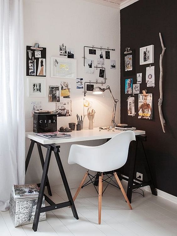 Стена возле стола может принимать в оформлении рабочего места дома самое непосредственное участие. Во-первых, на ней можно… писать. Конечно, предварительно наклеив специальную грифельную пленку. Во-вторых, на стене можно закрепить заметки «на память» или милые сердцу фото. Для этих целей подойдет пробковая, магнитная доска или натянутый на раму текстиль.