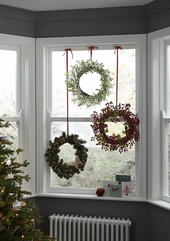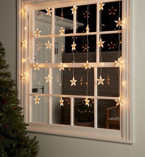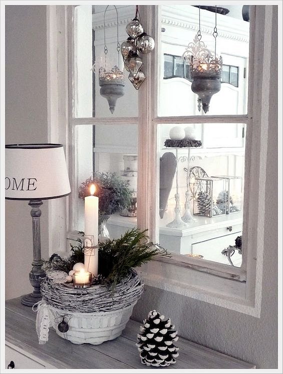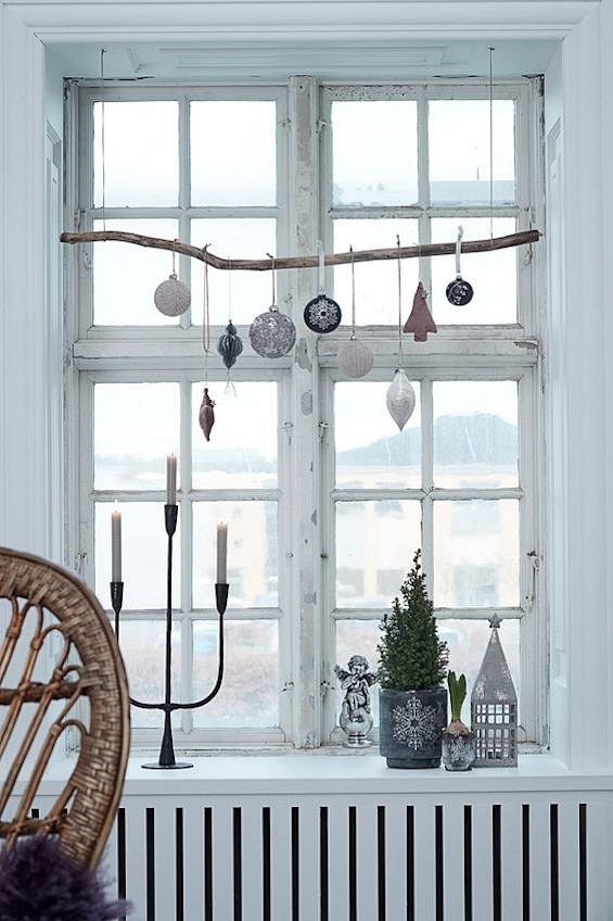 Кроме того, на подоконнике можно расположить новогоднюю композицию, а к карнизу прикрепить ленты с елочными игрушками и шарами. Не забудьте и о гирляндах – горящие огоньки в окне всегда выглядят очень празднично и эффектно.