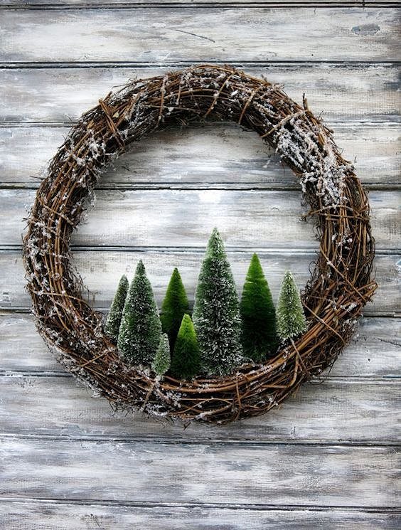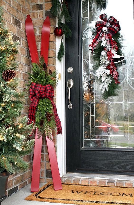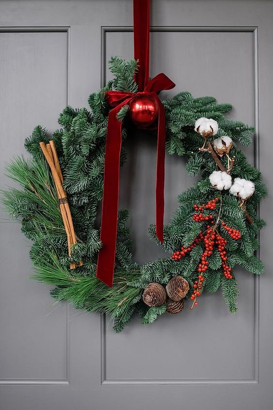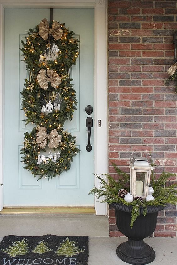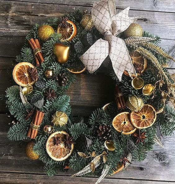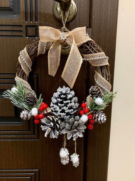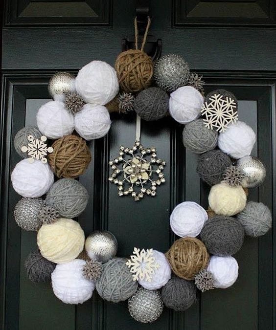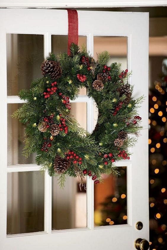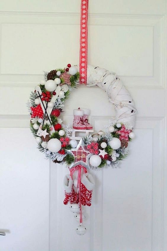 А вот для украшения двери традиционно используются новогодние венки. Венок, конечно, можно купить и готовый, но гораздо интереснее будет самодельный. К тому же, второго такого уж точно ни у кого не будет! Стилистика и цветовая гамма венка может быть разной – в зависимости от того, как вы решили декорировать к празднику свой дом.