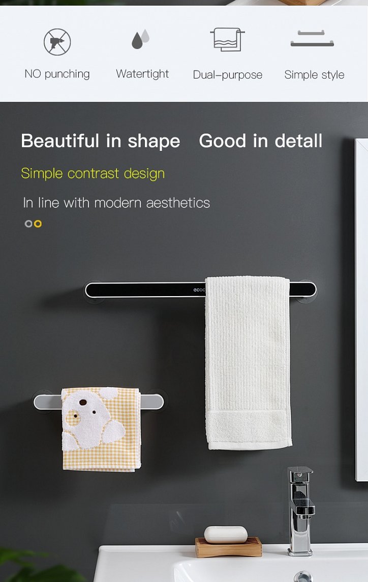 Если вы не хотите лишний раз сверлить стены в ванной – обратите внимание на самоклеящиеся держатели для полотенец. Стильные и удобные в уходе, они могут крепиться на любой гладкой и сухой поверхности – как на стене, так и на дверце или нижней поверхности шкафчиков.
