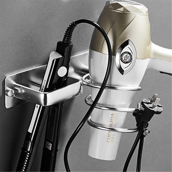 Металлический держатель в виде спирали предназначен для хранения фена в ванной. Кроме того, в соседнем отсеке с удобством может расположиться утюжок для волос или щипцы для завивки.