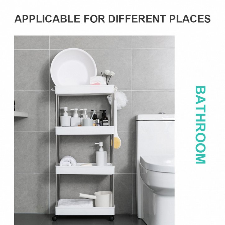Стойки этого 3- или 4-ярусного передвижного органайзера для хранения в ванной выполнены из нержавеющей стали, что обеспечивает ему прочность и долговечность эксплуатации. Вместительные полки позволят разместить на них все, что нужно, а благодаря роликам стеллаж быстро и без труда перемещается в нужное место.