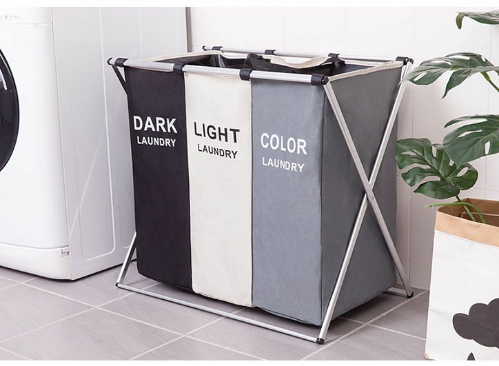 Вместительная и стильная корзина для грязного белья предусмотрительна разделена на 3 отсека: для тёмного, белого и цветного белья. Складная конструкция позволяет убирать ее, когда она не нужна.
