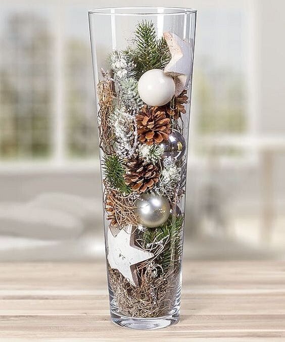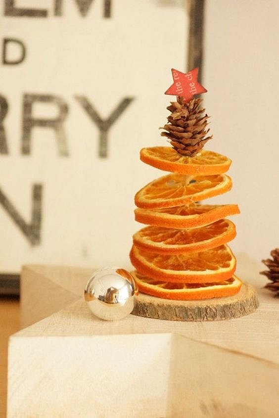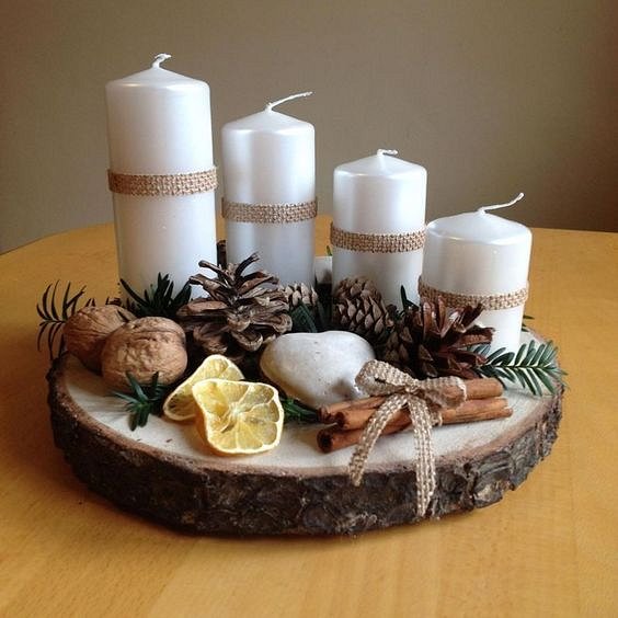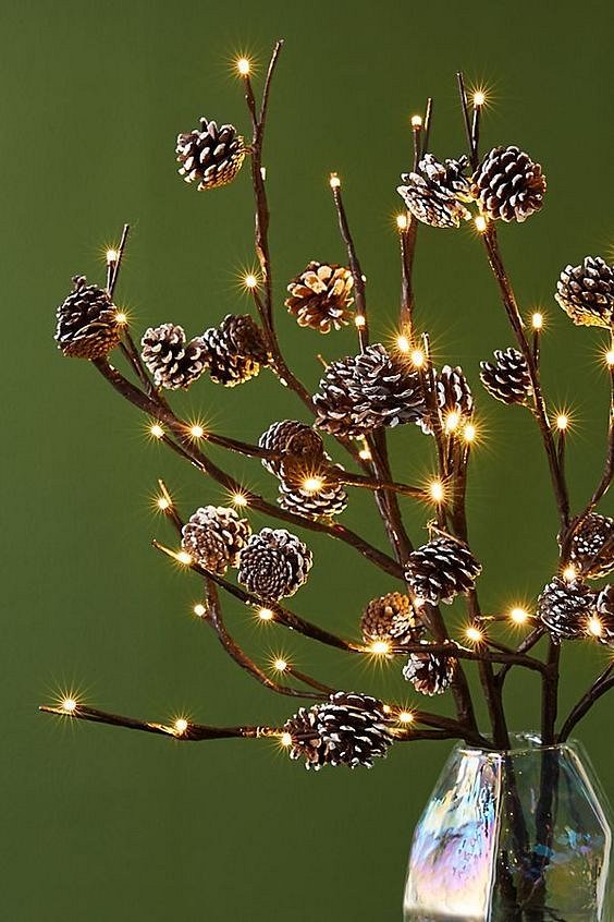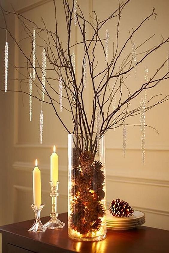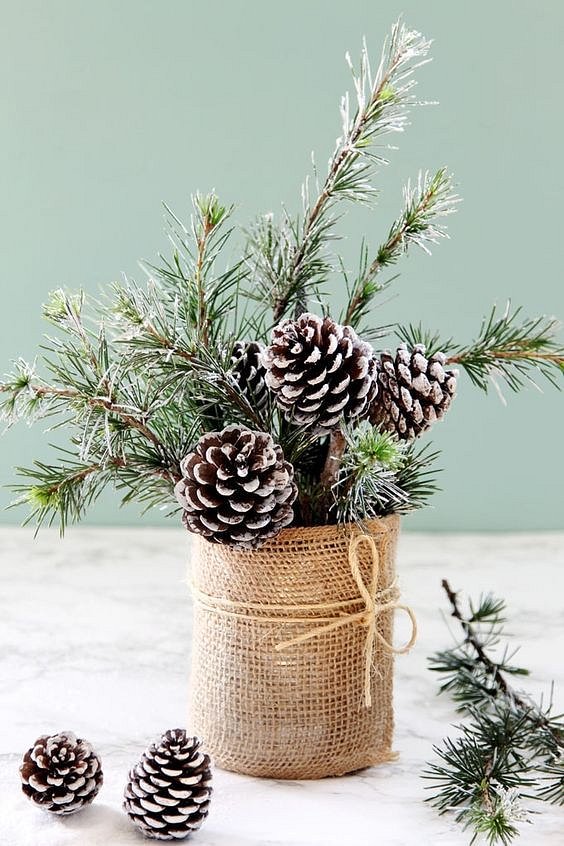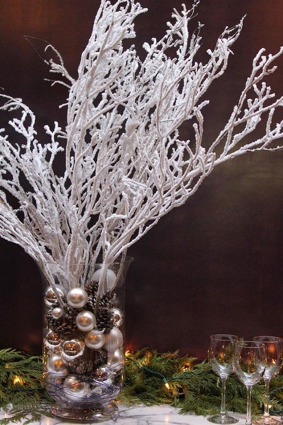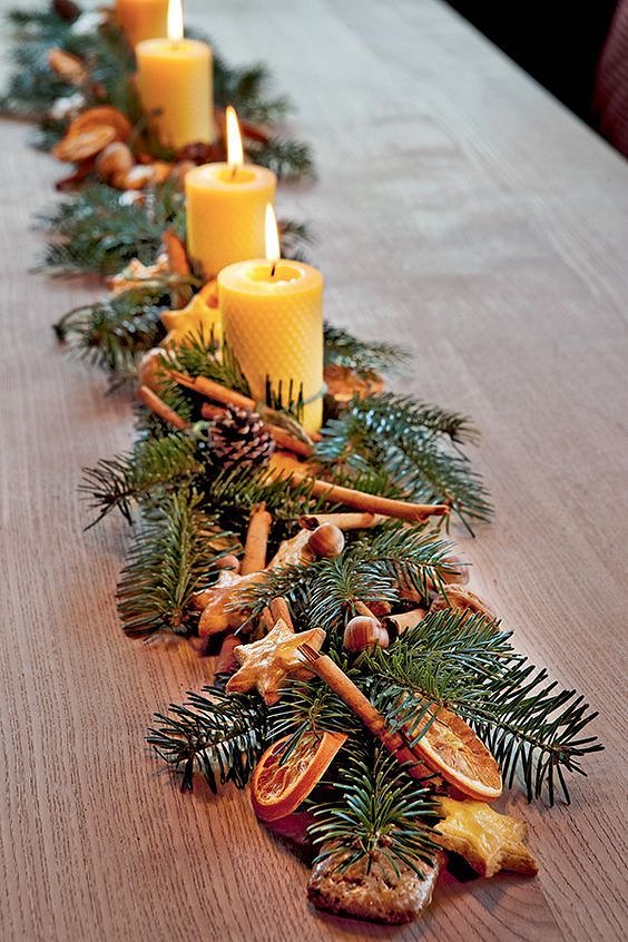 3. Природные материалы. Прекрасно дополнит новогодний интерьер и натуральный декор – шишки, яблоки, апельсины, хвоя, веточки вечнозеленых растений и пр. Для придания композиции более праздничного вида можно украсить ее золотой или серебристой краской из балончика или же “снежным” спреем.