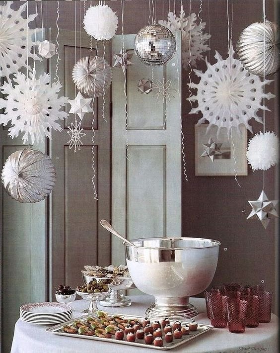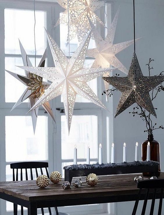 7. Снежинки, дождик и звезды. Этот легкий, почти невесомый декор – идеальное решение для декорирования потолка и люстры.