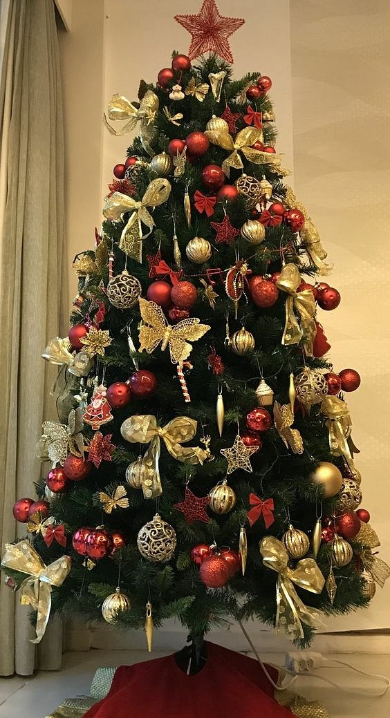 Развесьте шары, игрушки, бантики, дополните праздничное убранство золотыми бусами и мишурой, серпантином и гирляндами (их лучше повесить в самом начале – в этом случае елочка будет словно подсвечиваться изнутри). Чтобы елка выглядела аккуратно и гармонично, маленькие шары лучше повесить ближе к верхушке, а большие – на нижние ветки.
