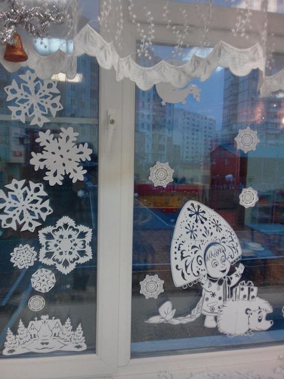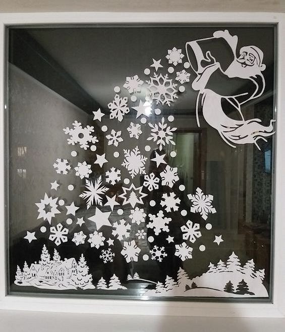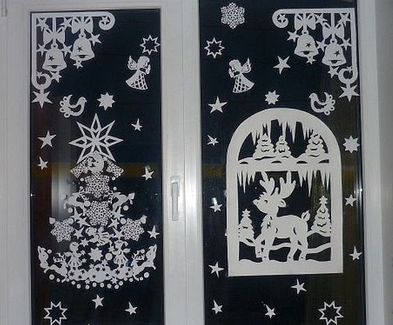 Если же вы хотите что-то более сложное и оригинальное – можно скачать из интернета готовые шаблоны, распечатать их и аккуратно вырезать мелкие детали. Чтобы после праздника трафареты можно было легко снять со стекла, клеить их лучше на раствор хозяйственного мыла.