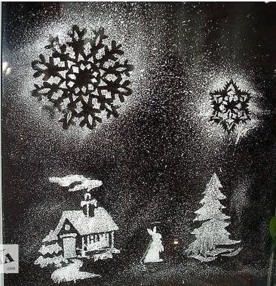 Интересный эффект получится и при использовании техники разбрызгивания. Для этого трафарет нужно закрепить на стекле, смочить в зубной пасте или краске зубную щетку и просто забрызгать отверстия в трафарете. Вы также можете использовать специальный спрей-снег. Когда вы снимете шаблон, на стекле останется «заснеженный» рисунок.Видео: декор окна снежными рисунками
