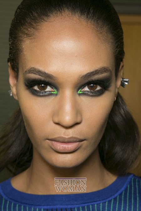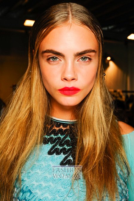 В этом весенне-летнем сезоне многие визажисты основной акцент сделали на глаза, подчеркнув их форму и цвет с помощью ярких теней, цветной подводки и объемной черной туши. Также пристальное внимание было уделено ровному и чистому тону и широким, естественной формы, бровям. Что касается макияжа губ, то здесь явным фаворитом стала яркая матовая помада.