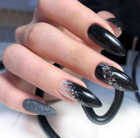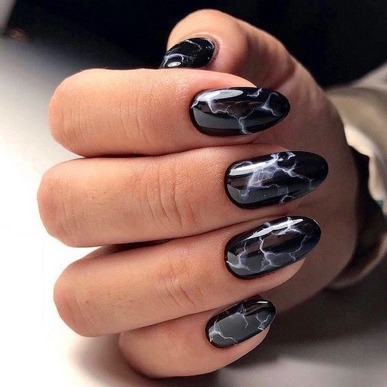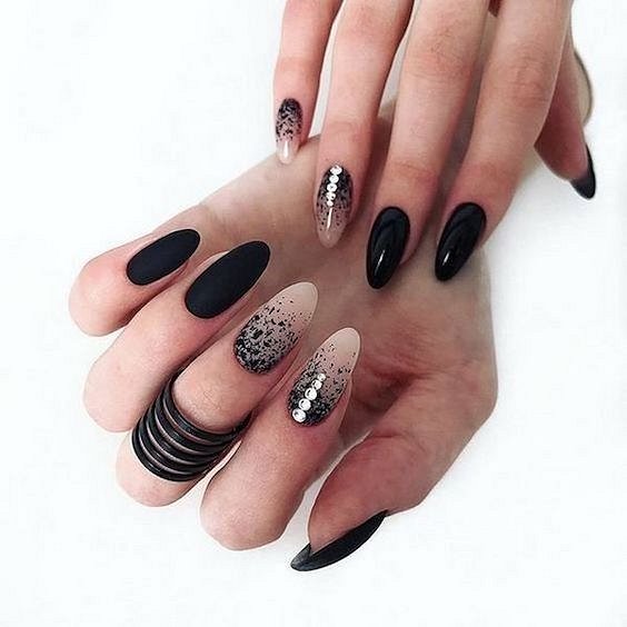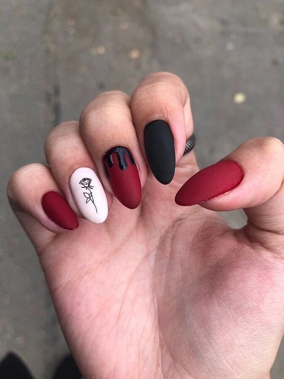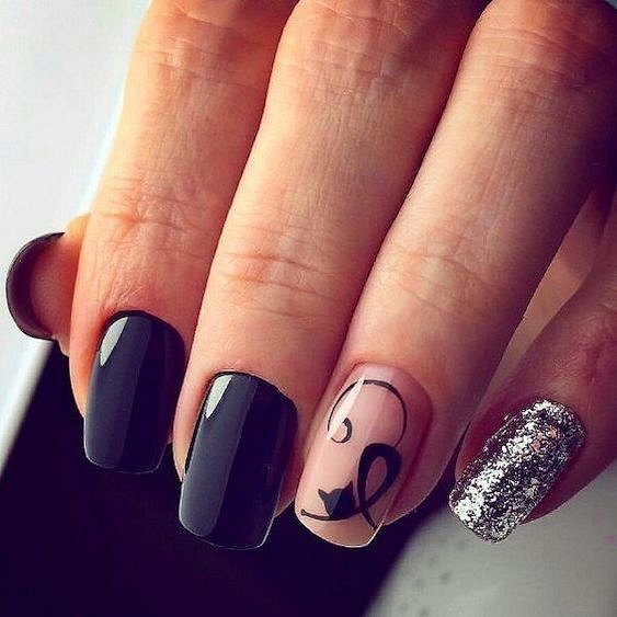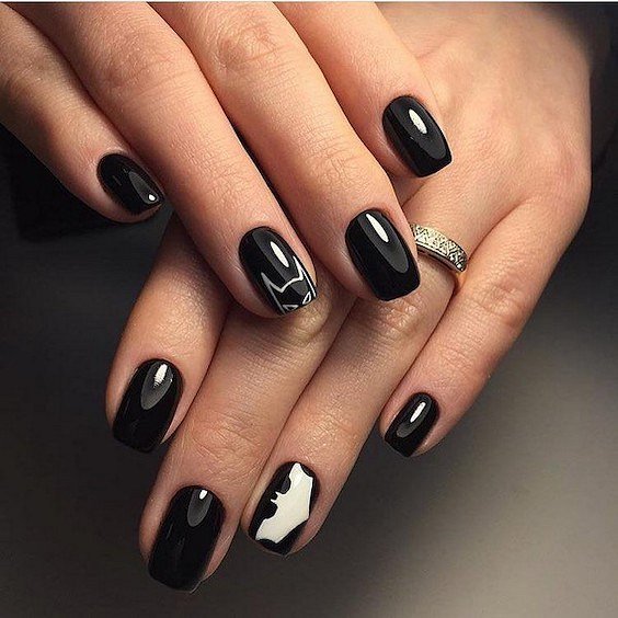 Черный маникюр на Хэллоуин – это всегда беспроигрышный вариант. Помимо обычного монохрома мастера маникюра предлагают множество вариантов: от красных потёков «крови» на черном лаке до двухцветных дизайнов с тематическими рисунками.