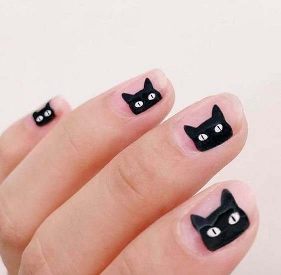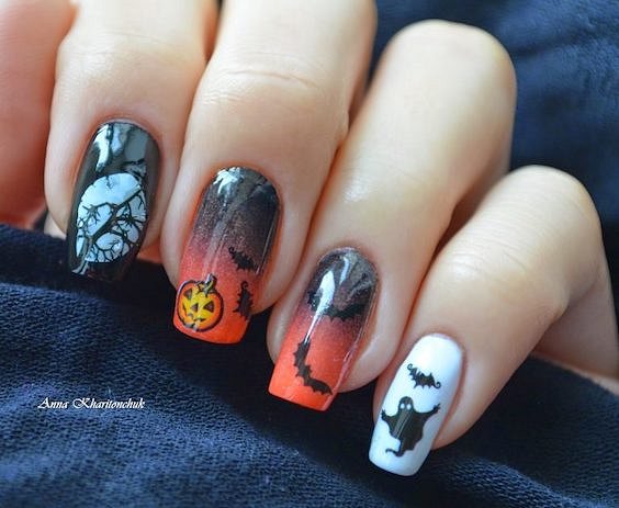 Самый популярный дизайн ногтей на Хэллоуин традиционно предполагает использование «кладбищенской» тематики: ведьмы, пауки, кресты, могилы, черные кошки, приведения, паутина и летучие мыши. Рисунки можно нарисовать или наклеить подходящие стикеры.