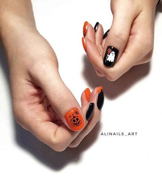 Совсем не обязательно рисунки на ногтях должны быть пугающими и зловещими –тыковки и паучки вполне могут быть и забавными, и совсем не страшными.