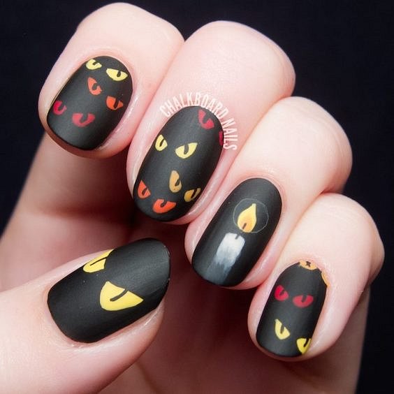 Чтобы сделать эффектный маникюр на Хэллоуин на короткие ногти, можно нарисовать на каждом ноготке летучих мышей или сделать простой маникюр на Хэллоуин, изобразив на черном фоне свечи и разноцветные пары глаз.