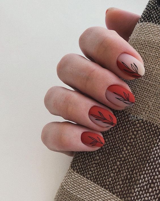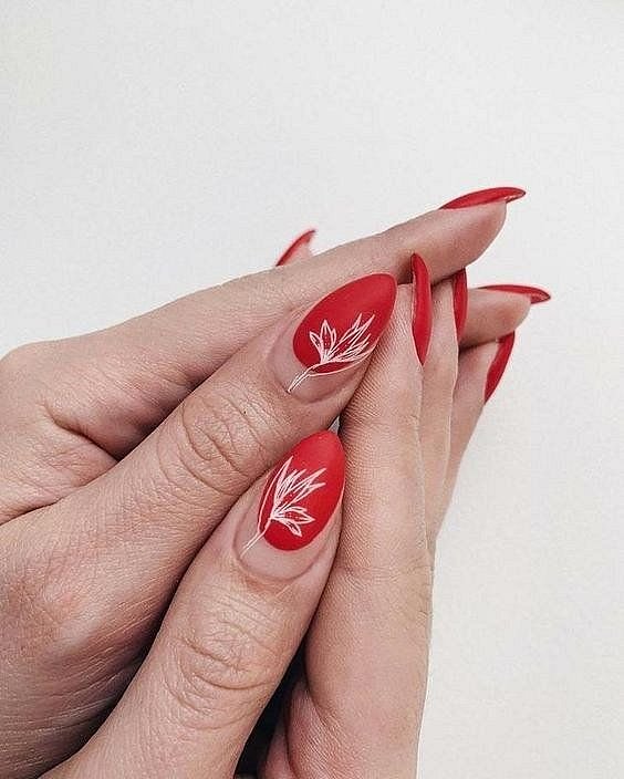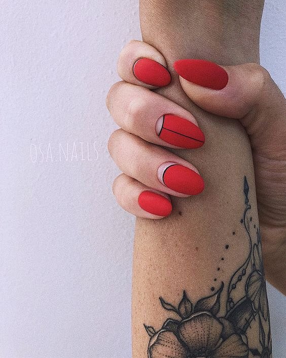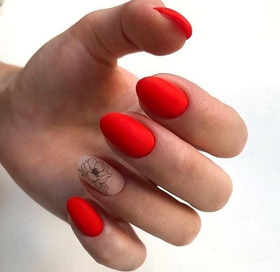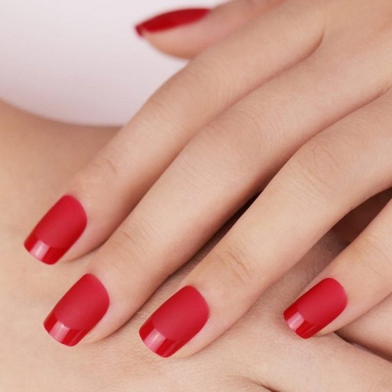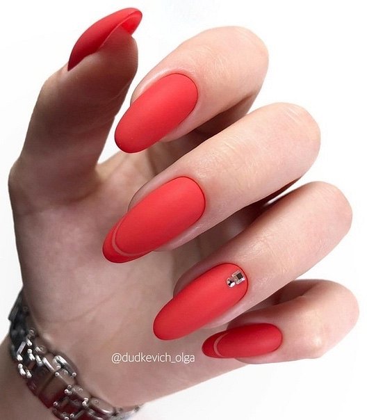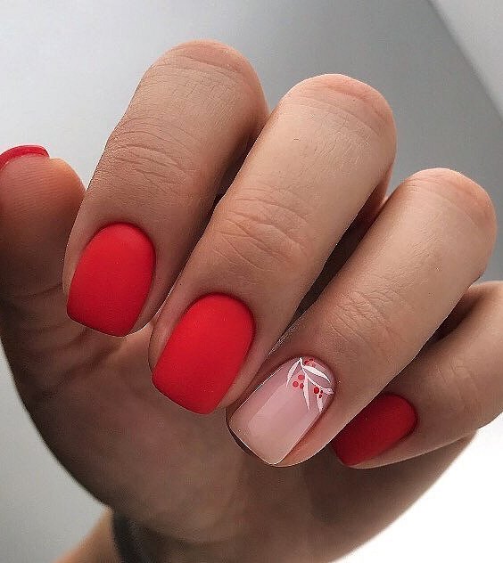 Матовое покрытие всегда выглядит изысканно и стильно. Для красного матового маникюра рекомендуются яркие, насыщенные оттенки лака. Дизайн лучше выбирать лаконичный (например, несложные рисунки, выполненные нейтральными оттенками). Если хотите добавить стразы – ограничьте их количество до минимума.