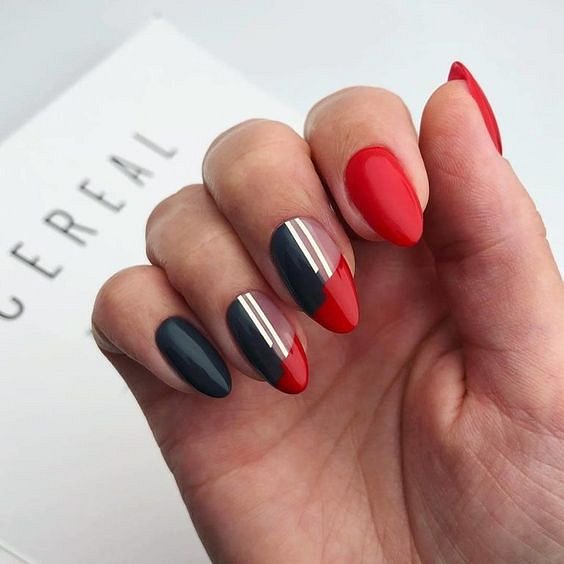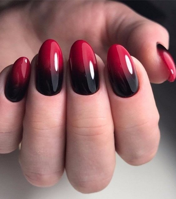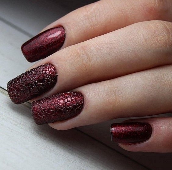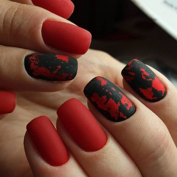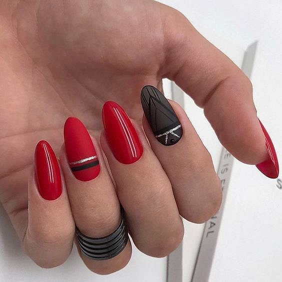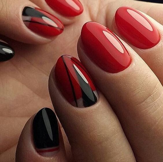 Самые популярные и модные варианты красно-черного покрытия с дизайном: маникюр с конфетти, омбре, блестящие акценты на 1-2 ноготках (стразы, глиттер, фольга) и, конечно же, рисунки (лучше всего смотрится геометрия). Главное – не переусердствовать, ведь этот дизайн броский уже сам по себе.