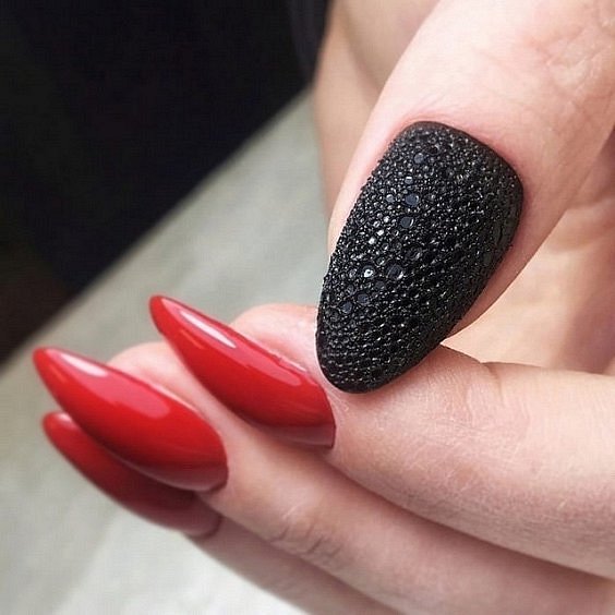 На длинных ногтях не рекомендуют делать красно-черный маникюр. Стразы будут уместны только в праздничном образе и не на слишком длинных ногтях. Хорошо будет смотреться матовое покрытие, лаконичные рисунки, золотые акценты и эффект омбре.