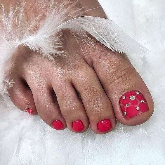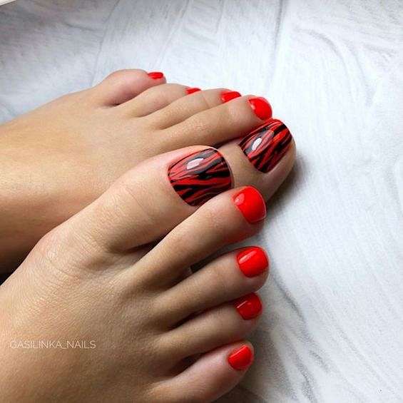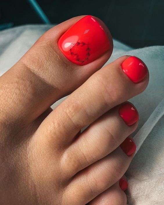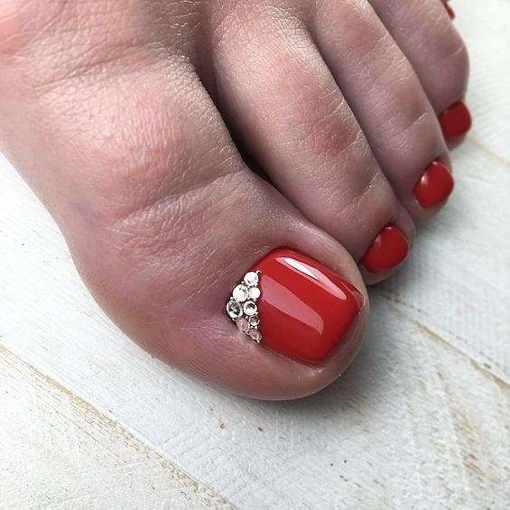 Однотонный педикюр с красным лаком – это беспроигрышный внесезонный вариант. Но когда приходит пора открытой обуви, хочется чего-то большего – и тогда мы делаем педикюр с дизайном.