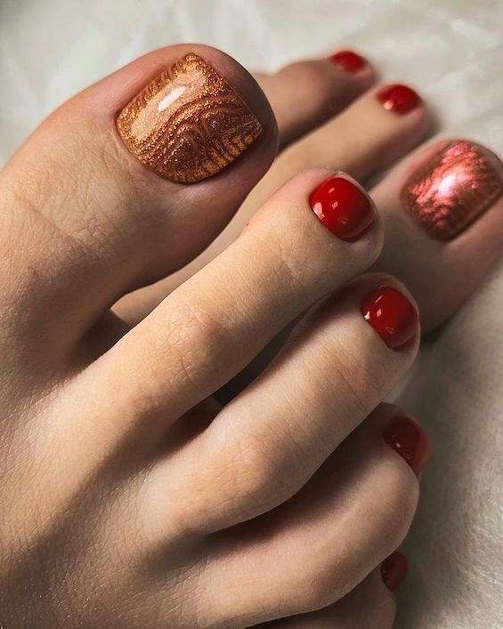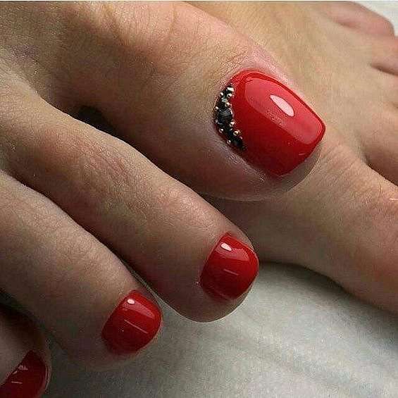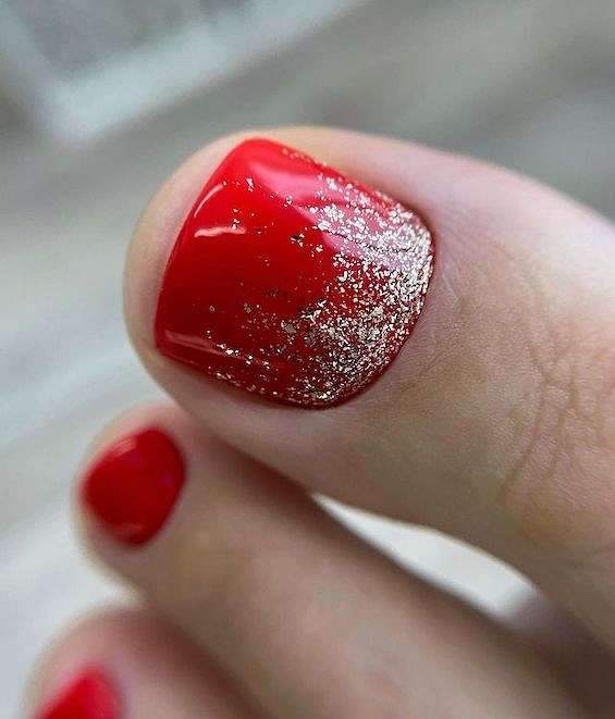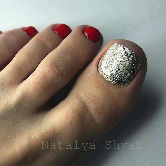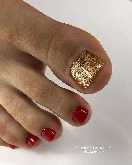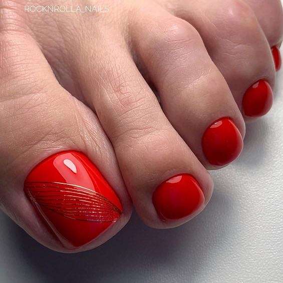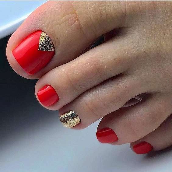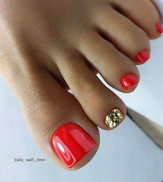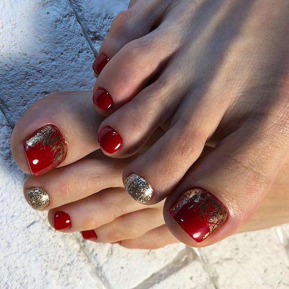 В дуэте с золотом красный лак выглядит просто роскошно! Это идеальный вариант для праздничного педикюра. Чаще всего золотым лаком покрывают один ноготок или делают золотистое омбре на 1-2 пальчиках.