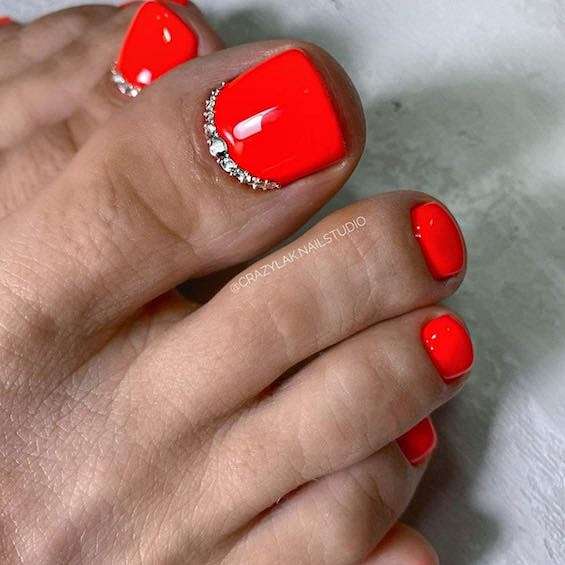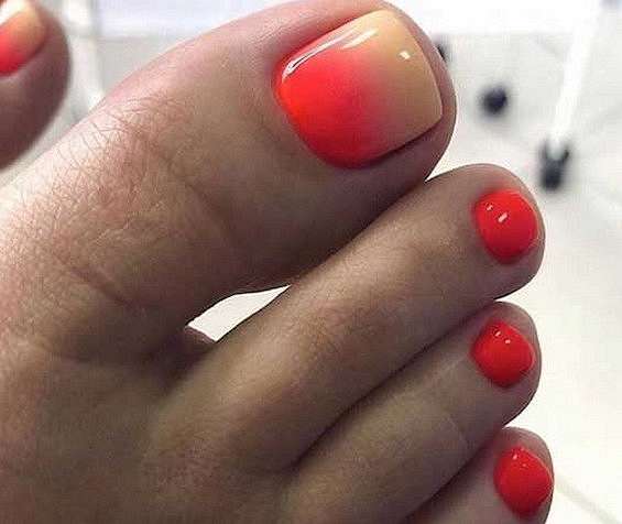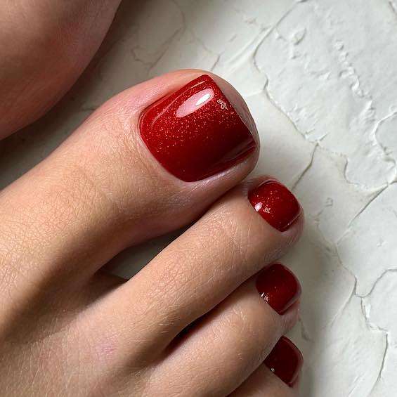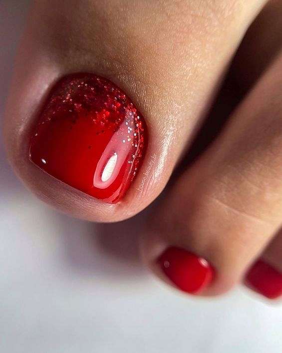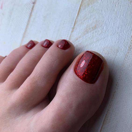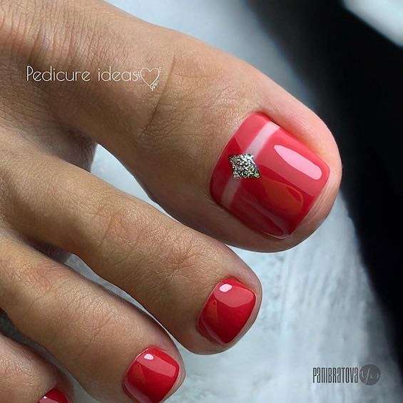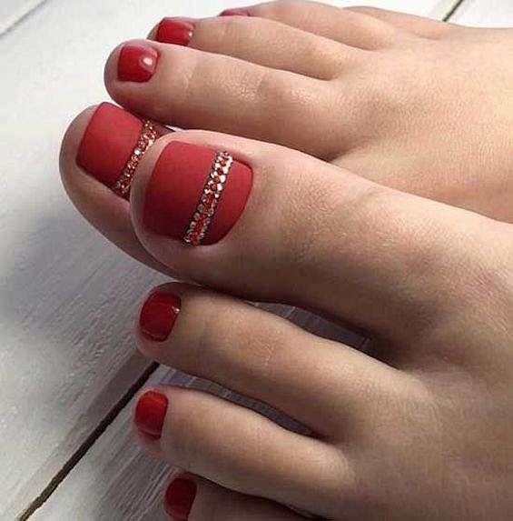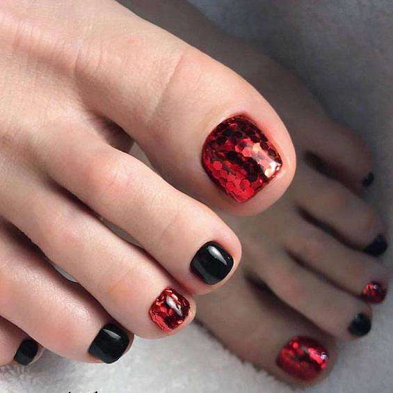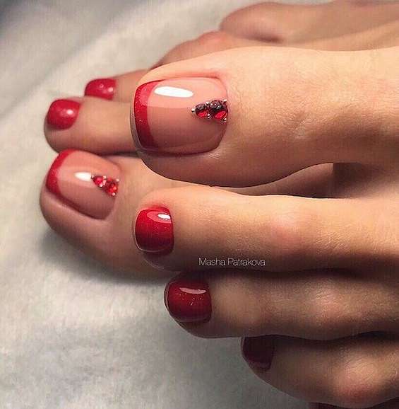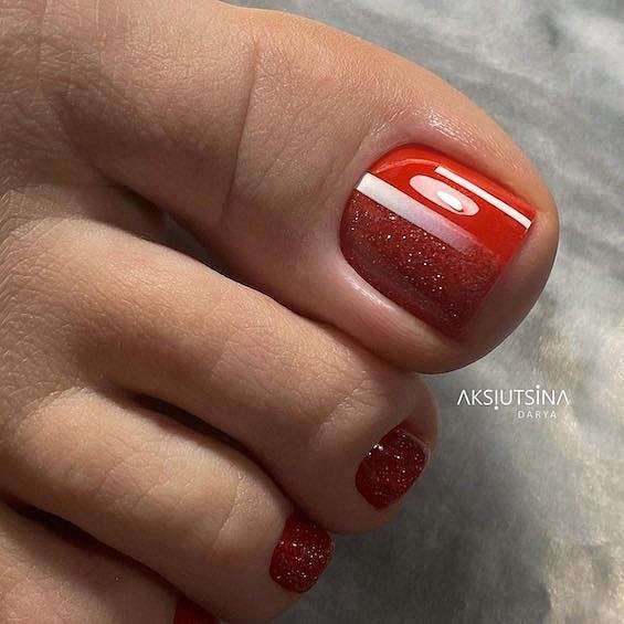 В дуэте с золотом красный лак выглядит просто роскошно! Это идеальный вариант для праздничного педикюра. Чаще всего золотым лаком покрывают один ноготок или делают золотистое омбре на 1-2 пальчиках.