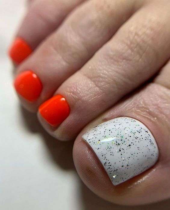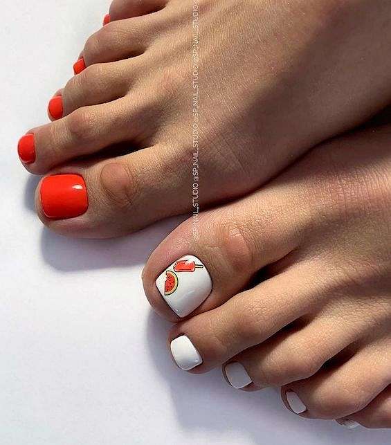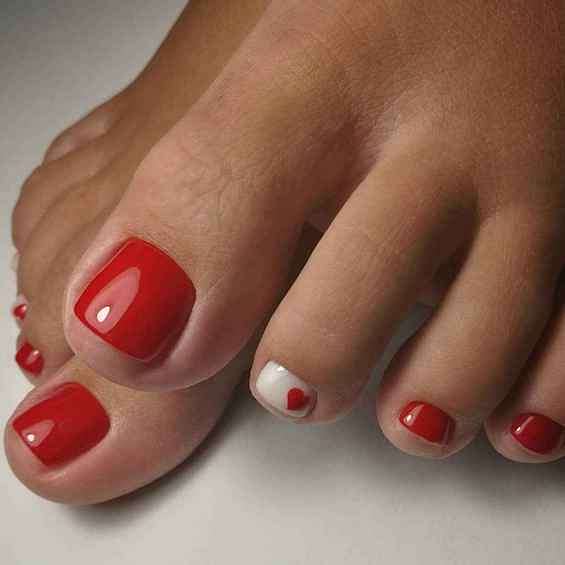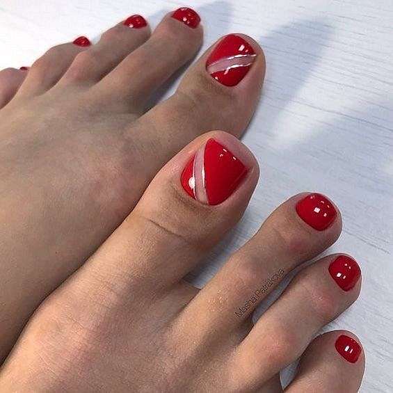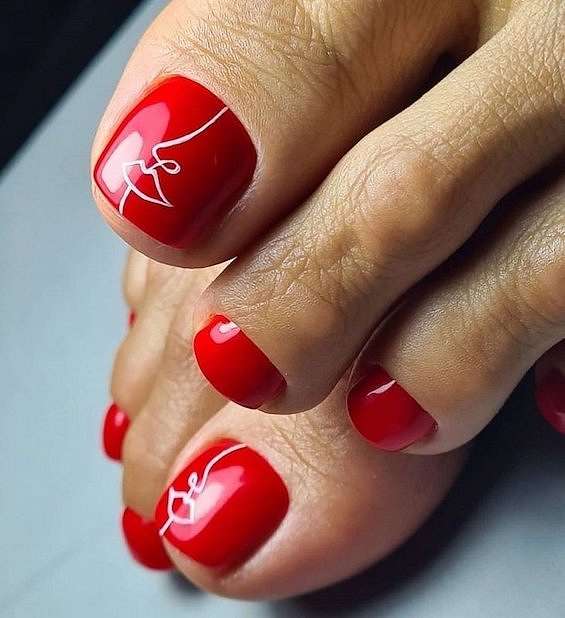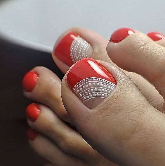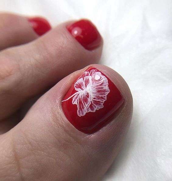 Идеальный компаньон для всех без исключения оттенков красного - белый лак. Он придаёт педикюру лёгкость и свежесть. Белым цветом можно выполнить рисунки на красном фоне (или наоборот) либо просто чередовать эти два цвета на ноготках.