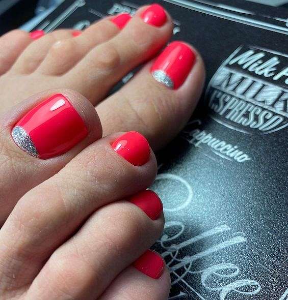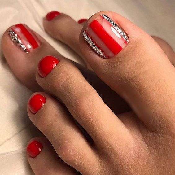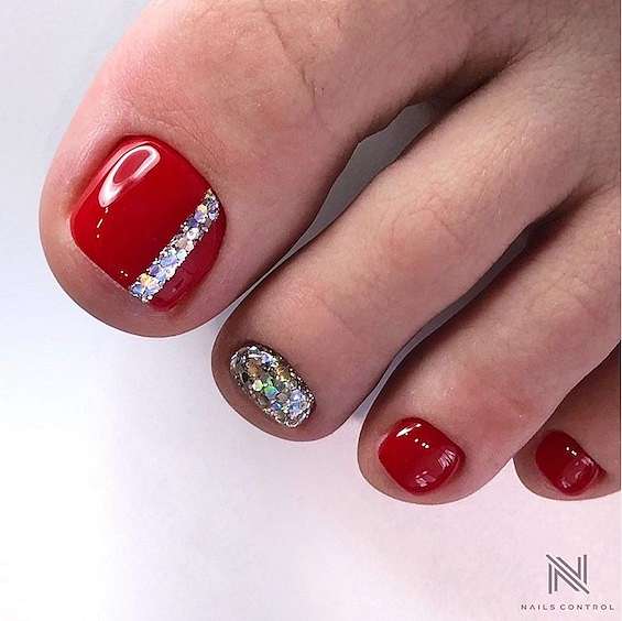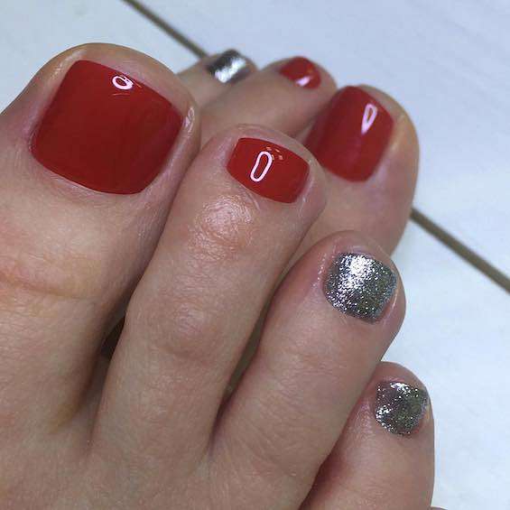 Не менее красив и красный педикюр с серебром. Смотрится такой вариант не так дорого и торжественно, как предыдущий, так что его вполне можно «носить» и в будни.