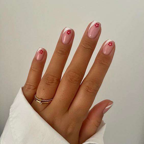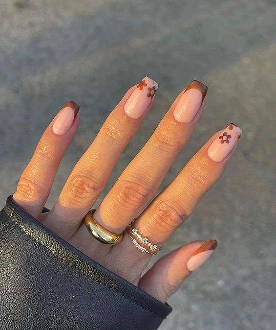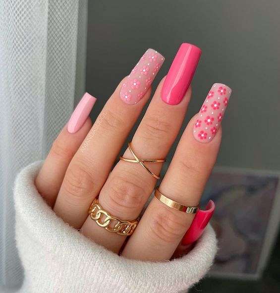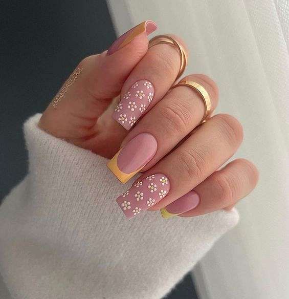 Очень красиво и женственно выглядит нежный цветочный маникюр на квадратные ногти. Это могут быть и лаконичные ромашки, рассыпавшиеся по ноготкам, и яркие наклейки, и лаконичные листочки.