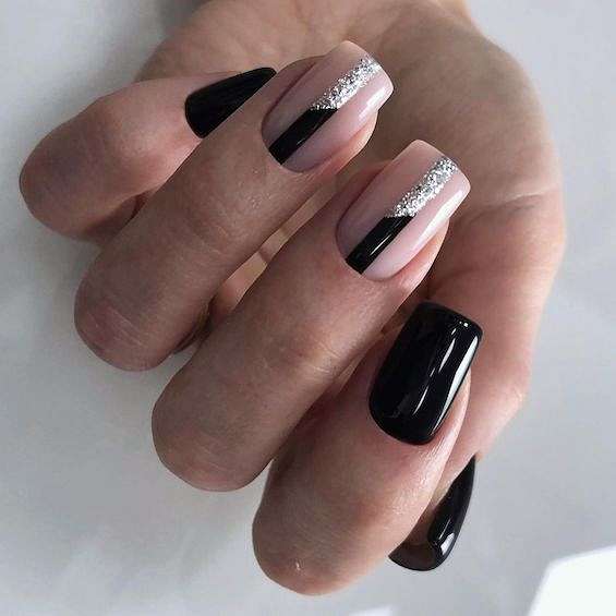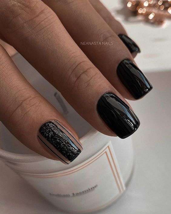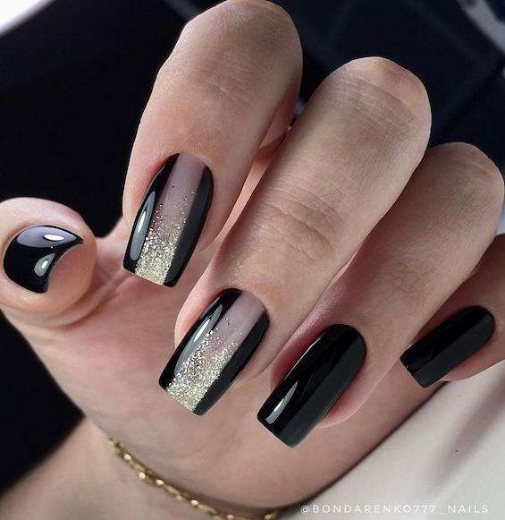 Украшенный золотистым или серебристым глиттером черный маникюр – это шикарный вариант для вечернего нейл-арта. Выглядит максимально эффектно и дорого.