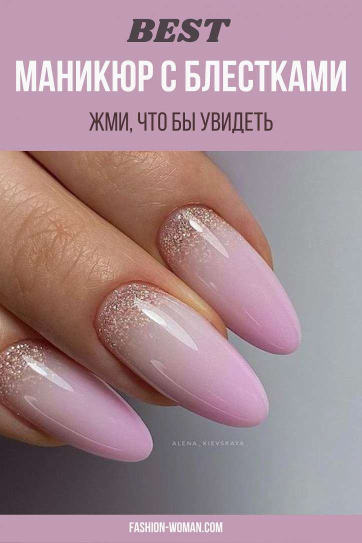 Маникюр с блестками лучше всего смотрится на ногтях формы «миндаль», овал и «мягкий квадрат».