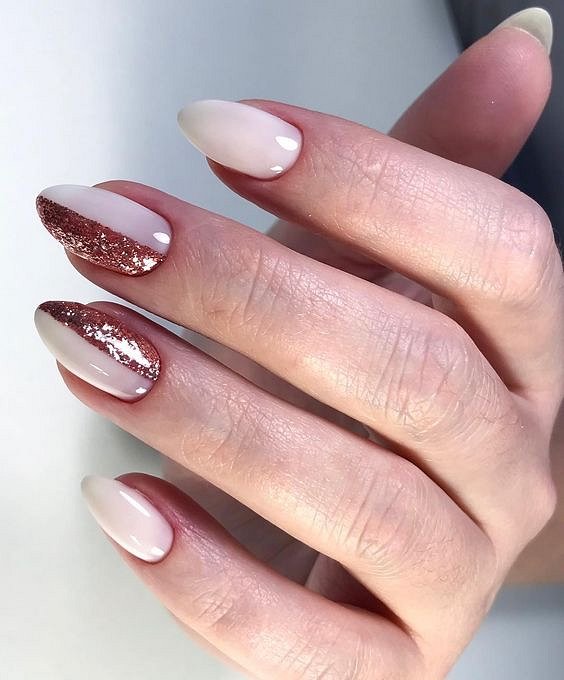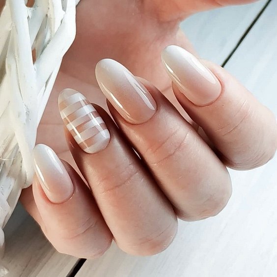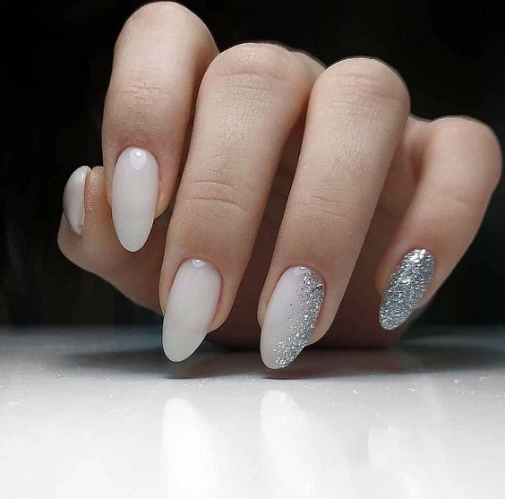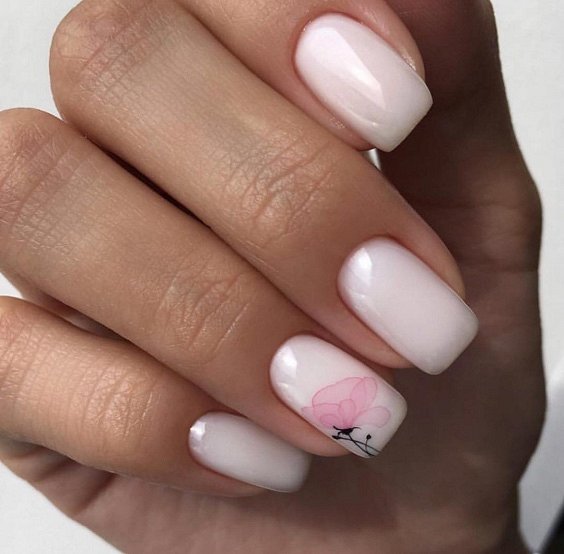 Подобное монохромное покрытие самодостаточно и прекрасно смотрится само по себе. Но если вы хотите разнообразить дизайн ногтей молочного цвета, можно поэкспериментировать с декором, добавив блестящие стразы, глиттер, фольгу или несложные белые рисунки. Кроме того, на основе молочных ногтей можно сделать французский маникюр или градиентный маникюр с блестками на 1-2 ногтях.