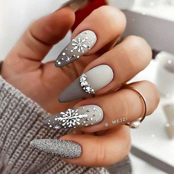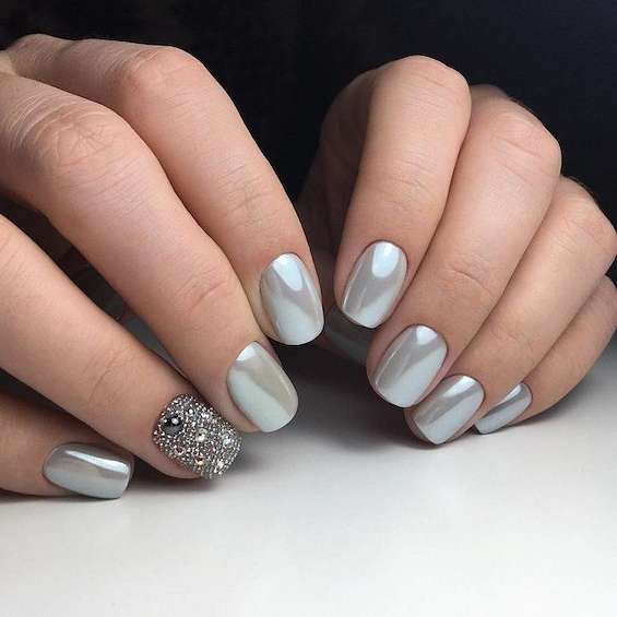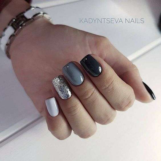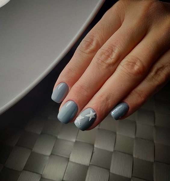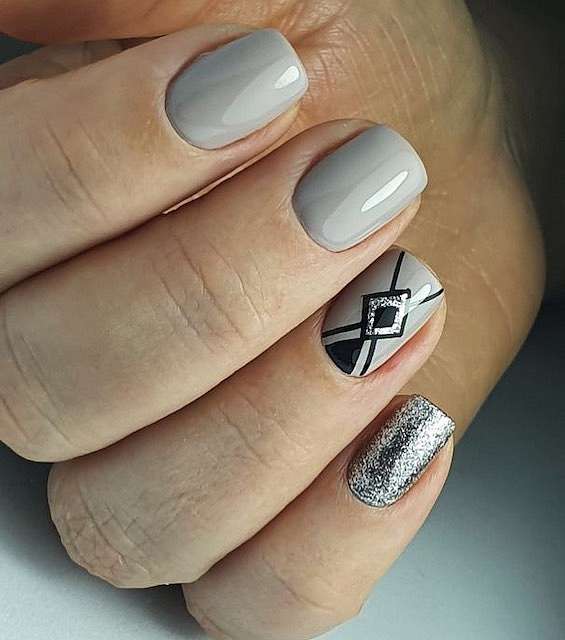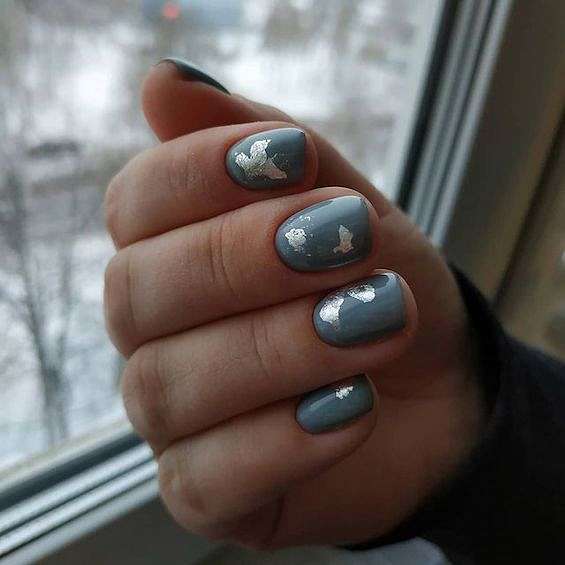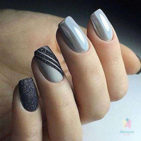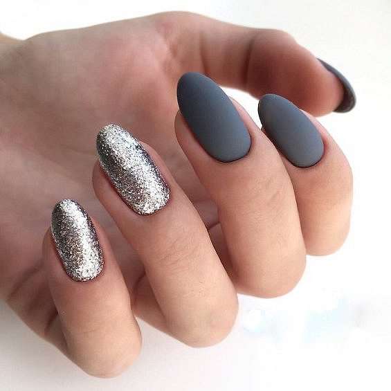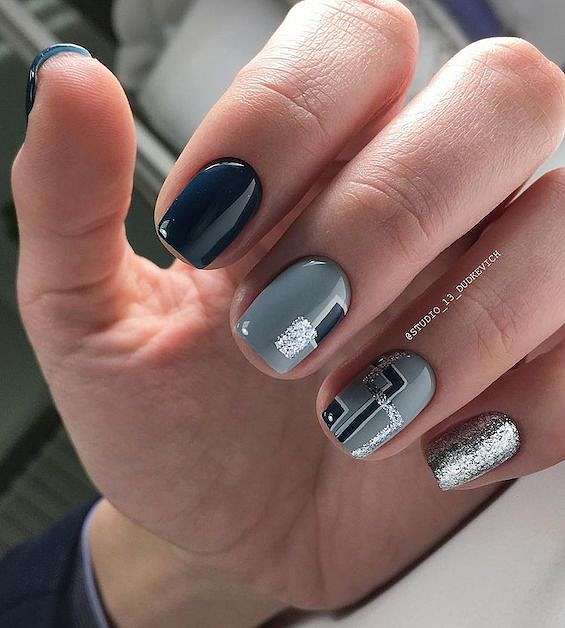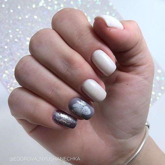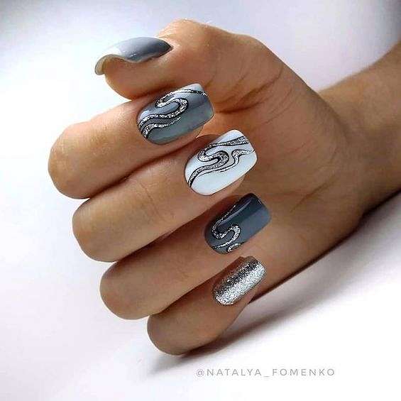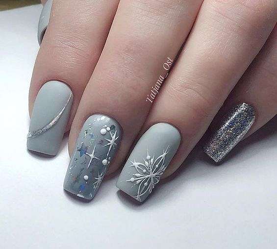 Серый с серебром – это типичное зимнее сочетание. В роли серебра могут быть и лаки «металлик», и фольга, и глиттер, и блестящие полоски.
