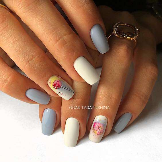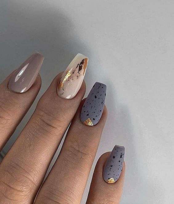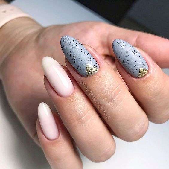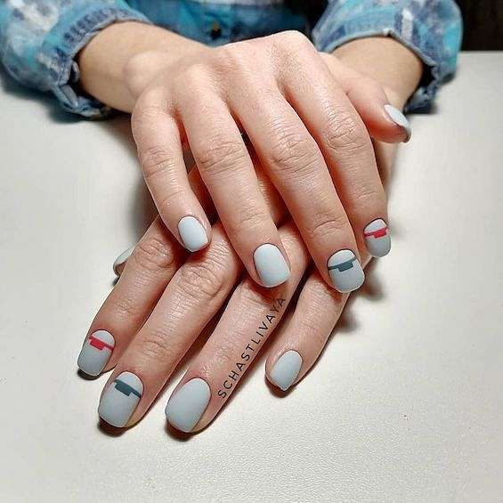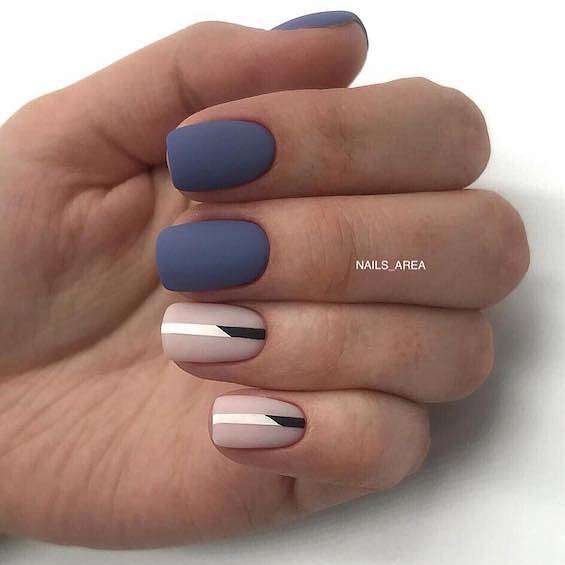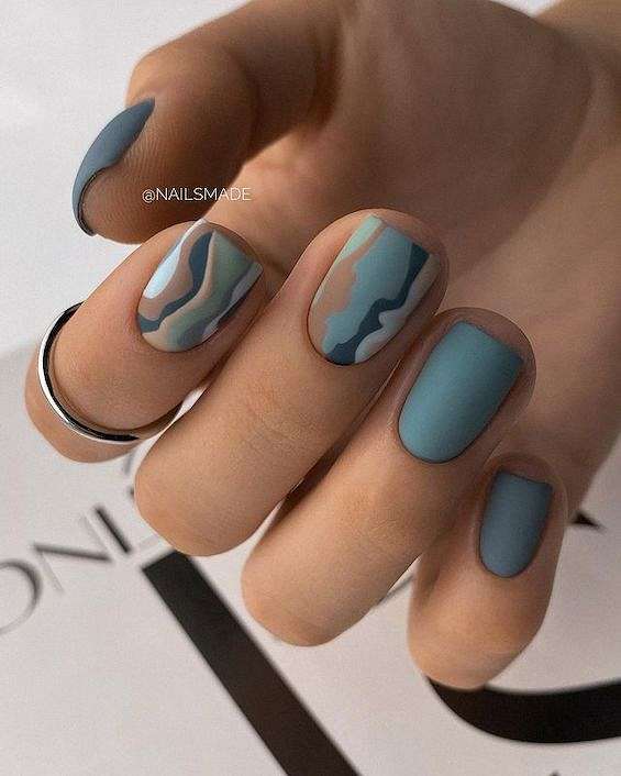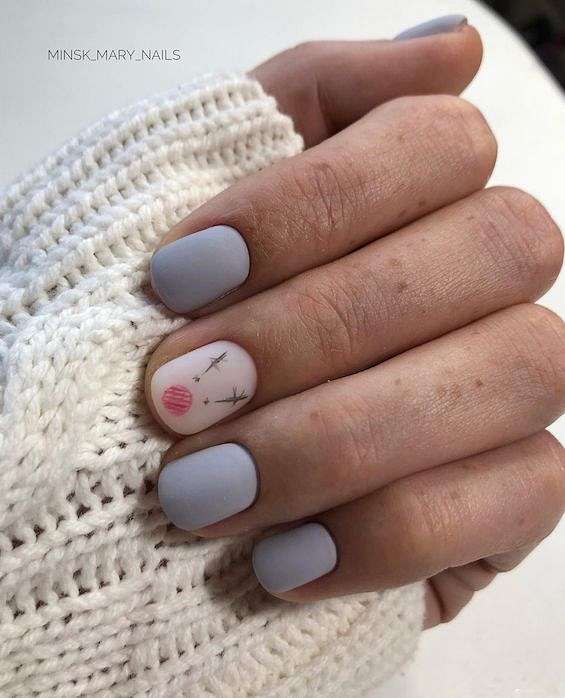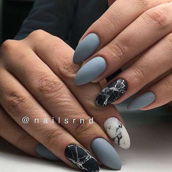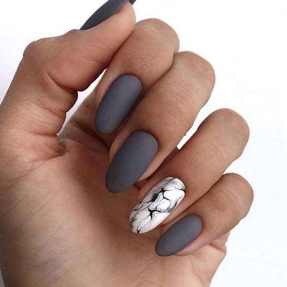 Матовое покрытие всегда придаёт маникюру элегантности и утончённости. Но если однотонное покрытие хочется чем-то разнообразить, можно добавить эффект мрамора, абстрактные и геометрические узоры или лаконичные рисунки.