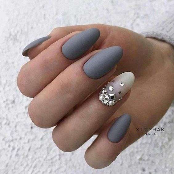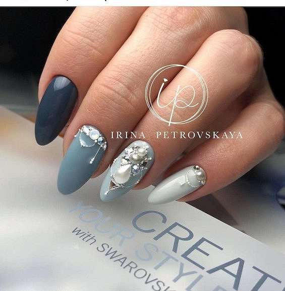 - серый маникюр со стразами и жемчужинами;
