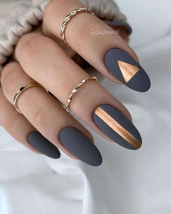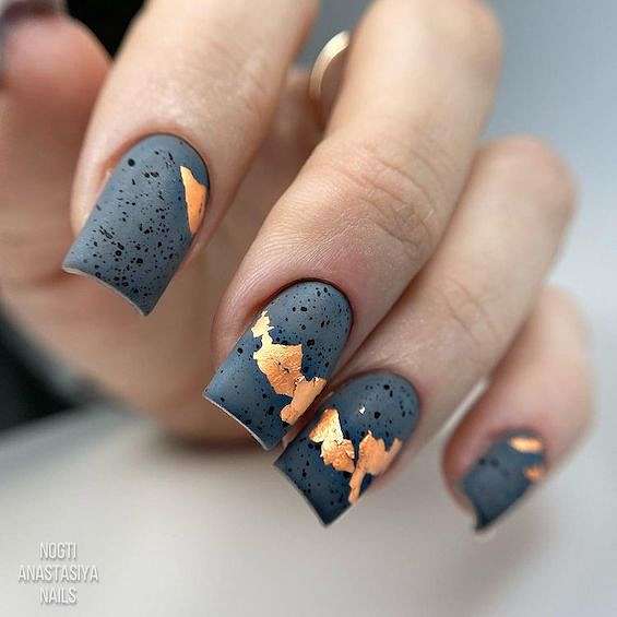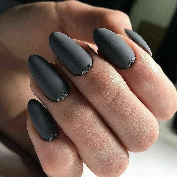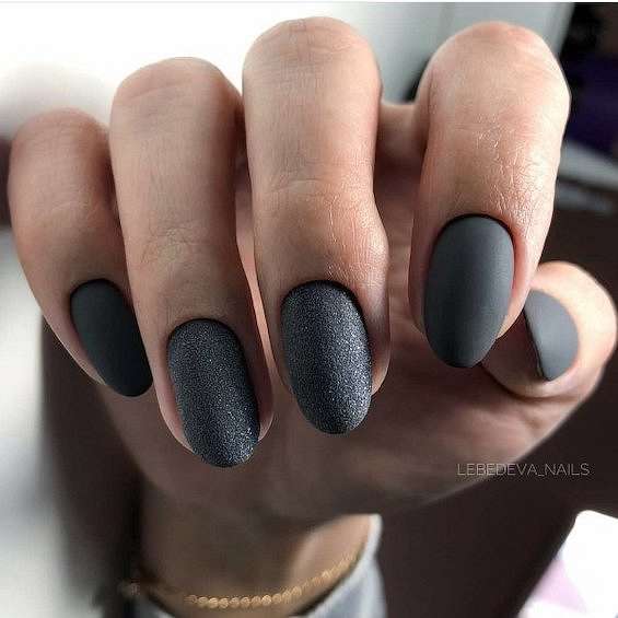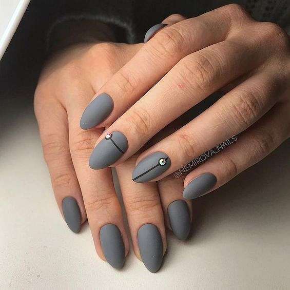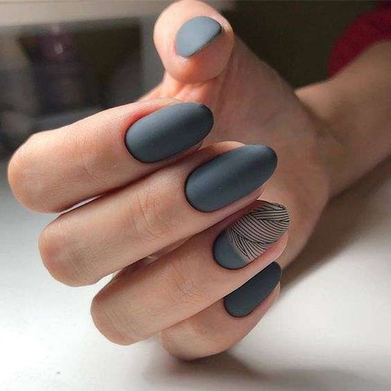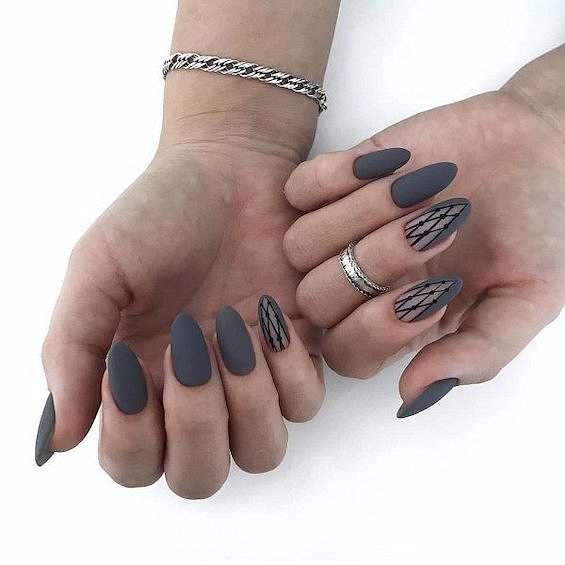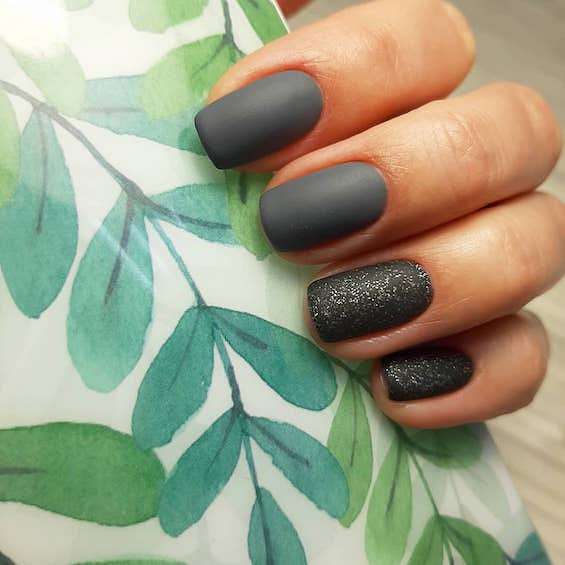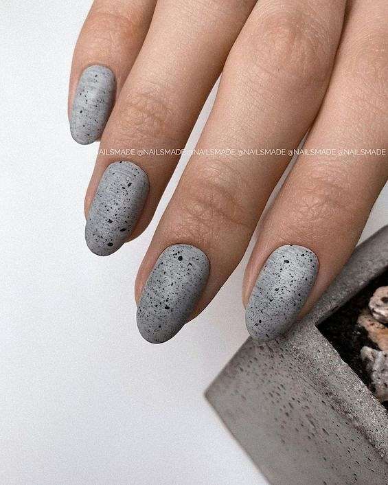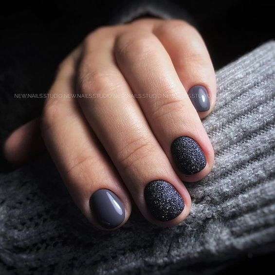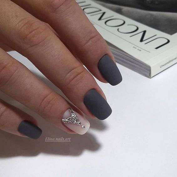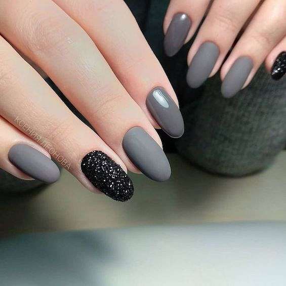Темно-серый маникюр может быть смягчённой альтернативой черным ногтям. Идеальный вариант для игры с текстурой.
