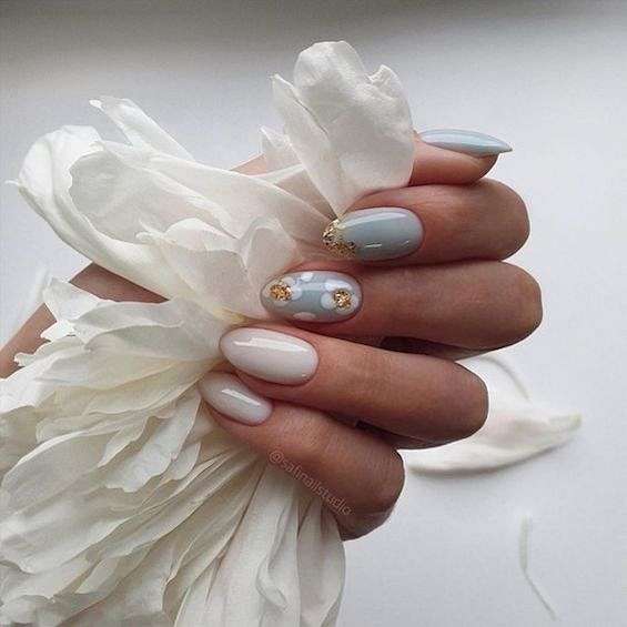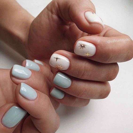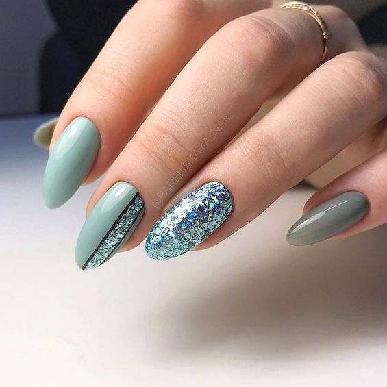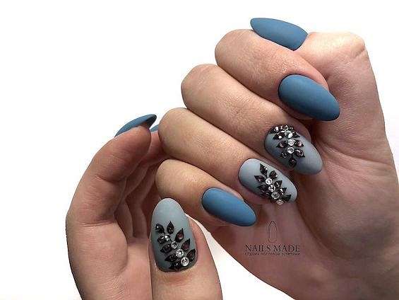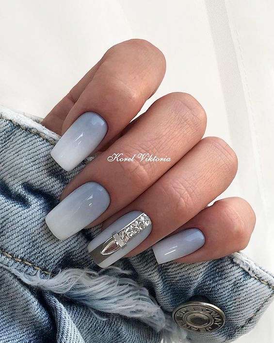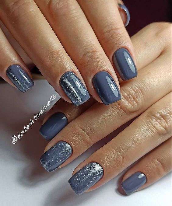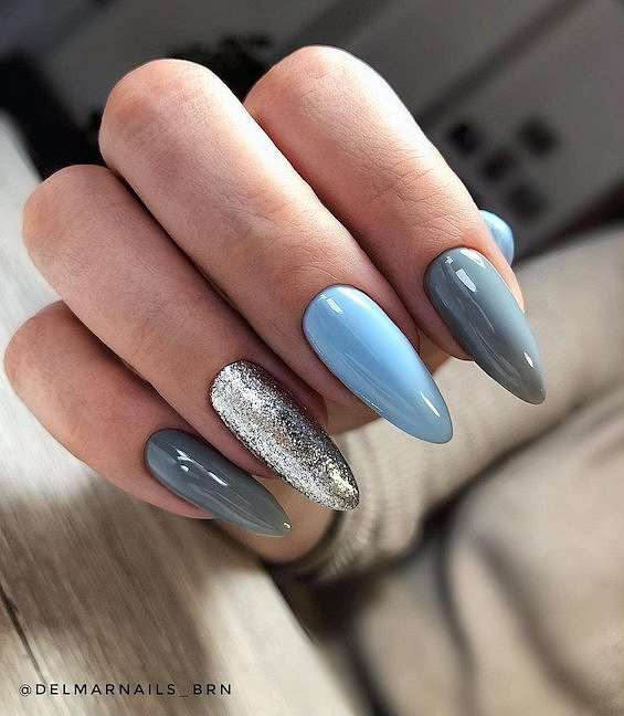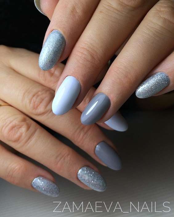 Серый и голубой. Одно из самых популярных сочетаний в холодное время года. Можно дополнить блёстками и металликом.