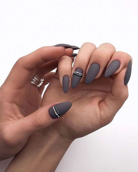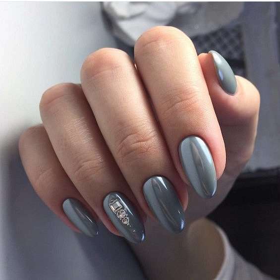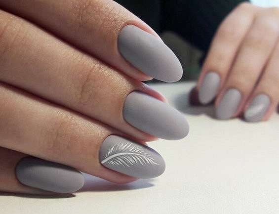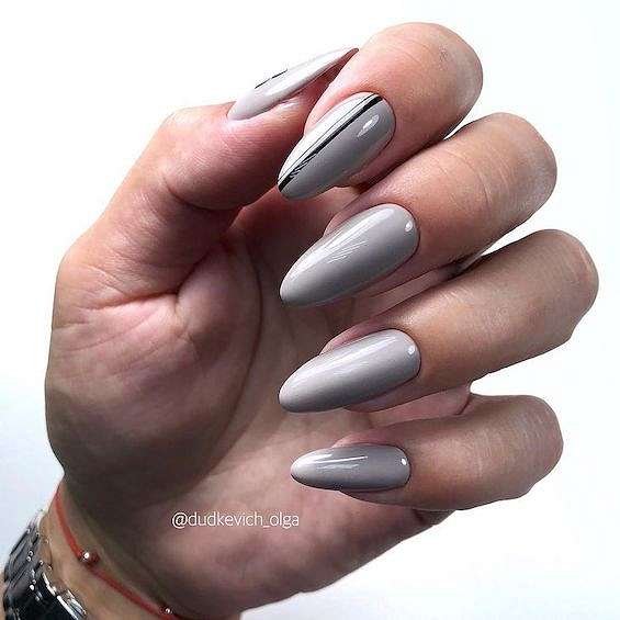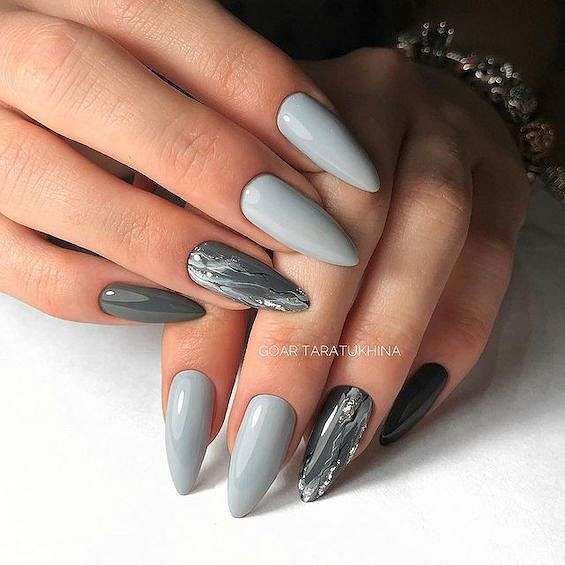 Длинные ногти позволяют реализовать самые смелые ваши фантазии, так что выбирайте, не стесняясь! Особенно хорош серый маникюр на длинных ногтях миндаль, овал и квадрат.