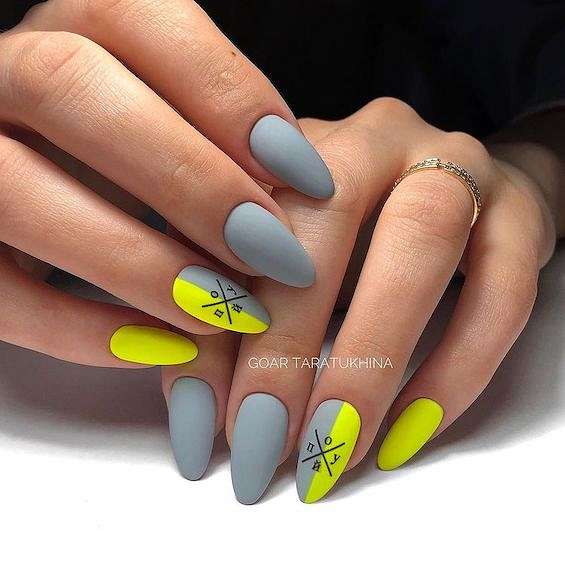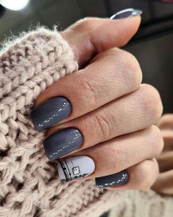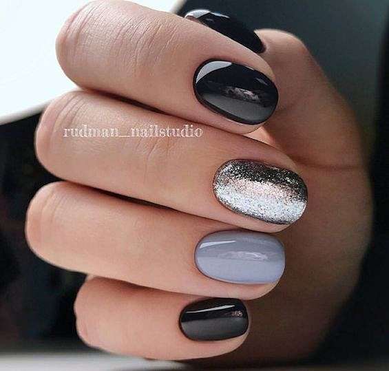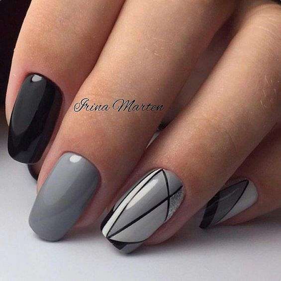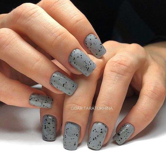 Черный и серый. Помимо выделения черным отдельных ноготков, очень интересно смотрится серый маникюр с черными брызгами, рисунками и геометрическими элементами.