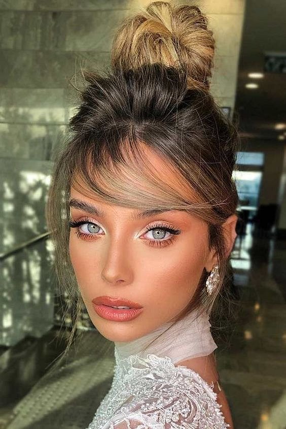 Косая челка придает образу шарма и прекрасно «вписывается» в любую прическу. С прямой челкой прекрасно сочетаются пучок с элементами плетения, укладка в стиле ретро и объемный хвост. А вот локоны, французская коса и прически в греческом стиле одинаково хорошо смотрятся и с любыми челками, и без них.