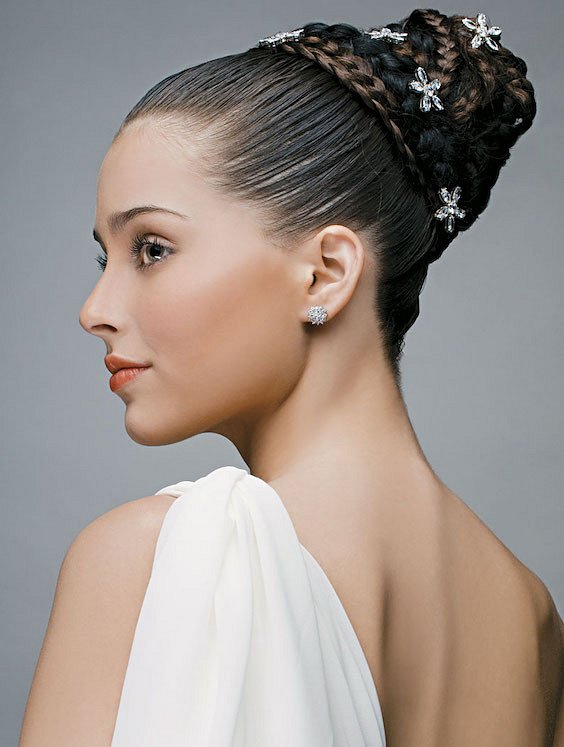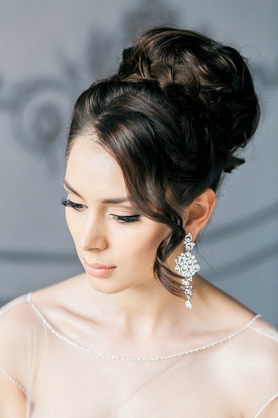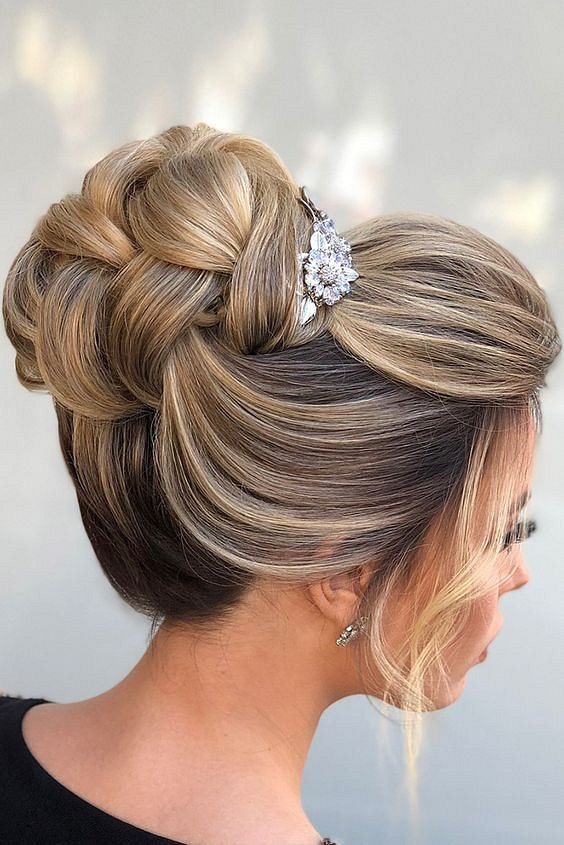 Самые распространенные варианты высоких причесок – высокий пучок, легендарная «бабетта», укладки в греческом стиле, «корона», прически с собранными на затылке туго закрученными локонами и варианты с многоуровневым плетением.