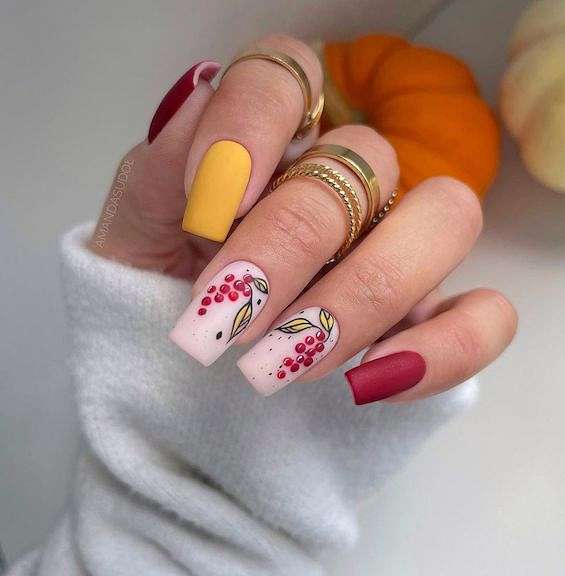 Amidst this sartorial shift, nail art becomes a visual ode to nature's metamorphosis. Adorned with yellow leaves, delicate branches, and cascading raindrop motifs, the seasonal masterpiece takes center stage, encapsulating the very essence of the golden season.