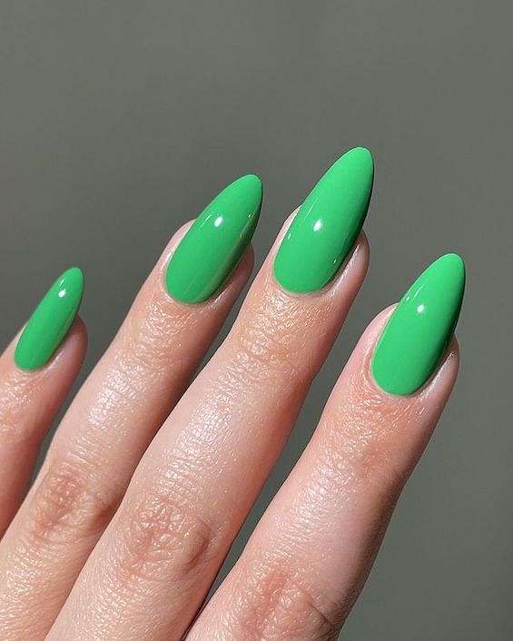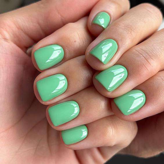 A beautiful green manicure looks original even in monochrome. The most popular colors of the season are neon green, mint shades, olive, and young green.