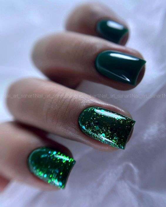 - Green nails with shiny accents (foil, liquid metal, glitter)