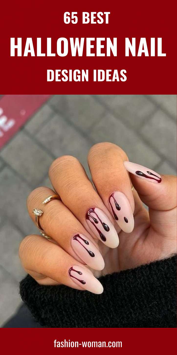 To create an eye-catching Halloween manicure for short nails, you can draw bats on each nail or go for a simple design by depicting blood streaks and colorful pairs of eyes.