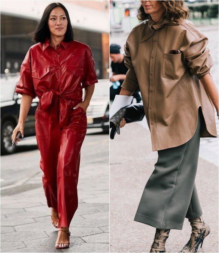 Вещи из кожи – это макротренд, который уже не один сезон лидирует на подиумах и пробудет с нами еще долго. Рубашка из кожи универсальна. Носим как верхний слой, если надеть под нее водолазку или футболку. Поверх рубашки можно надеть тренч или пальто, тем самым утеплиться за счет многослойности.
