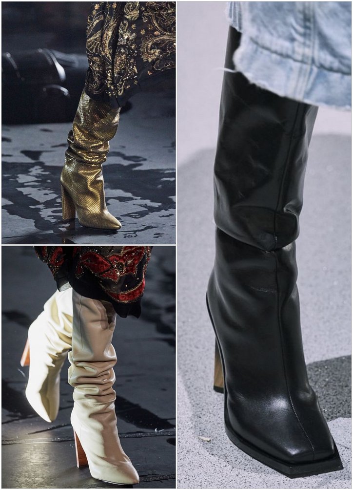 Модель сапог с широким голенищем остаётся актуальной не первый сезон. Трендом года можно назвать квадратный нос, но, возможно, не все смогут такую модель обуви внедрить в свой гардероб. В коллекциях весна-лето 2020 мы можем также наблюдать и обувь с острым носом. При выборе сапог следим за тем, чтобы они заканчивались в узкой части ноги. Если сапоги будут заканчиваться посередине икры (в самом широком месте), то визуально вы укоротите свои ноги и они будут казаться толще.